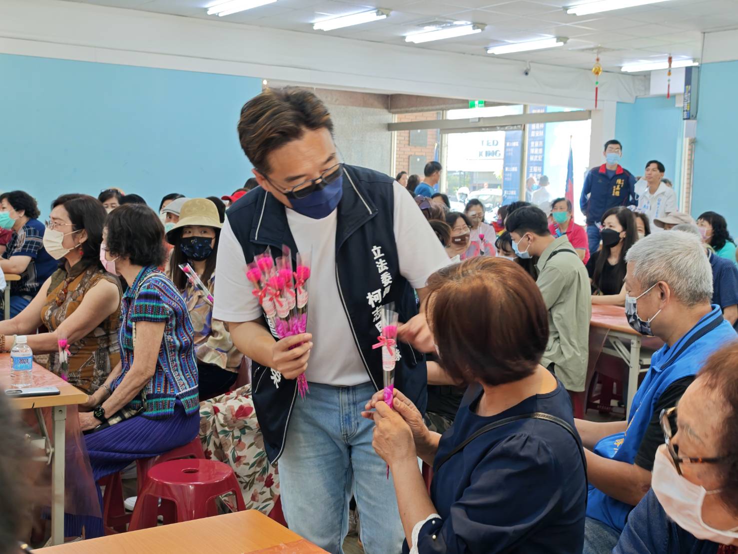 ↑圖說:市黨部副主委、柯志恩立委辦公室主任曹桓榮代表柯志恩主委致送康乃馨香皂花(圖片來源:國民黨高雄市黨部提供)