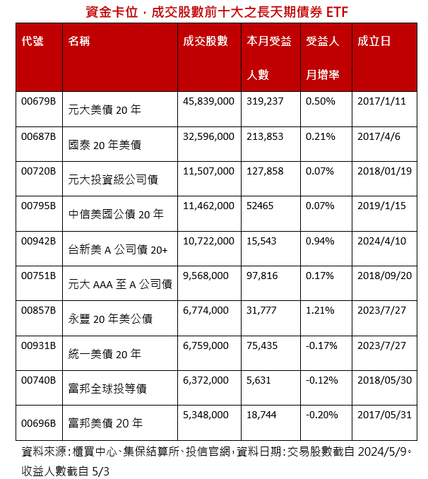 債券ETF受益人數逐月創新高,已超過158萬人,檢視近期熱門成交的長天期債券ETF,包括元大美債20年(00679B)、國泰20年美債(00687B) 等,今年4月才成立的台新美國20年期以上A級公司債券ETF(00942B),也擠入前五大。