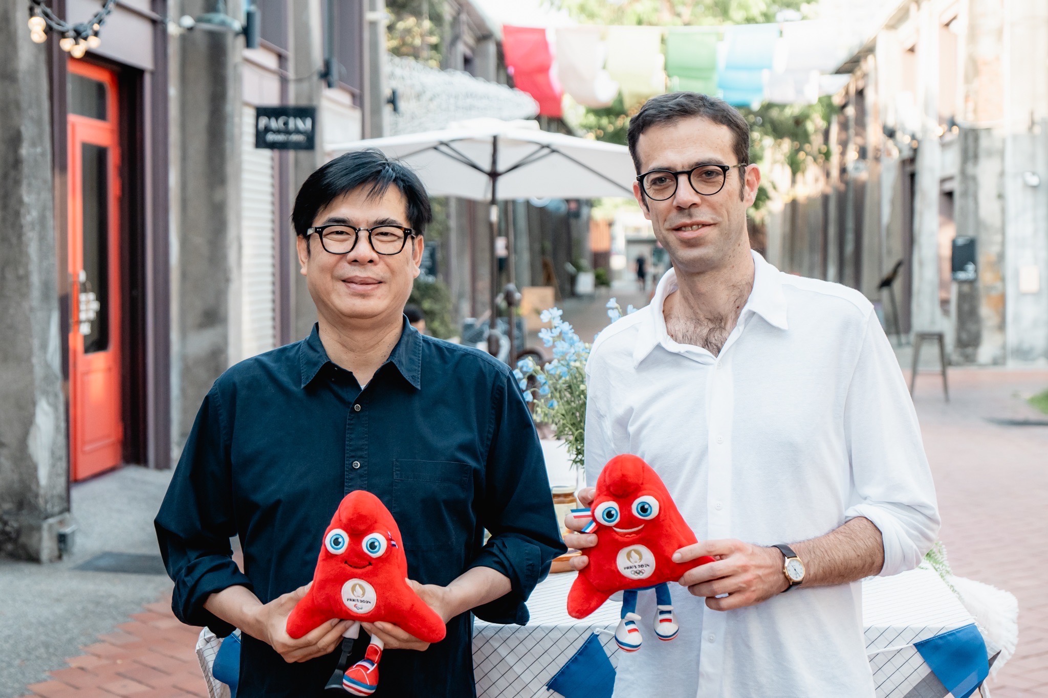 ↑圖說:陳其邁(左)與龍燁和巴黎奧運吉祥物Phryge(弗里吉)。(圖片來源:高雄市行國處提供)