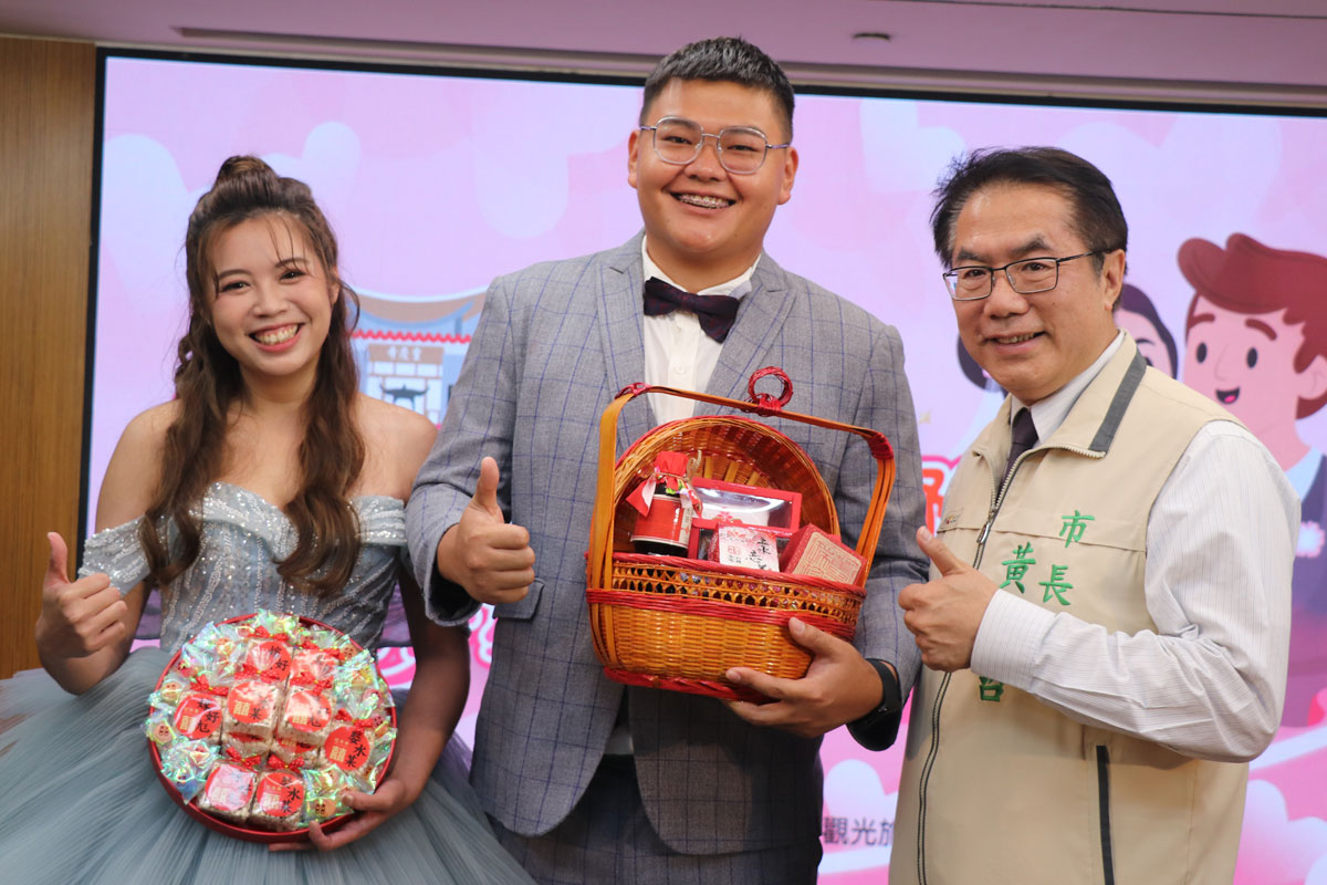 台南觀旅局今日(5/13)正式推出「最佳嫁娶服務散步路線」,邀請論及婚嫁的新人報名本次遊程,旅程將由專業雙人導覽老師帶領遊客漫步台南街頭,感受台南傳統婚嫁禮俗文化。市府今日召開宣傳記者會,邀請媒婆吳秀緞以及新人到場,並由市長黃偉哲親自送上新婚祝賀禮盒。市府說明,今日到場的兩位新人在台南經友人介紹,相識相戀,而最佳嫁娶服務散步路線剛好提供兩人籌備婚禮,拍婚紗、採買迎娶禮品的一條龍服務。