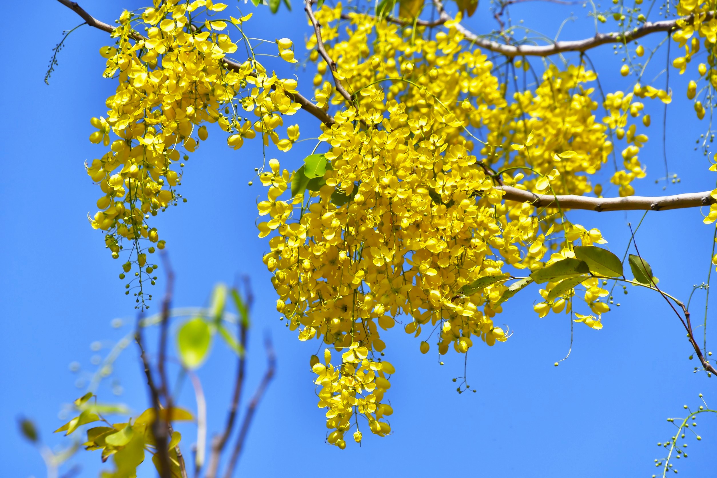 春末夏初正是阿勃勒開花時節,樹上垂吊著一串一串金黃綻放的花朵,在藍天輝映下搖曳生姿,當花瓣隨風起舞,或花瓣鋪滿大地,閃耀的金黃色,為這城市增添勃勃生機。在左營區九如四路、苓雅區和平路、光華路、林德街、廣州一街、鳳山區南京路、輜汽路、楠梓區高雄大學路、援中路都有阿勃勒的蹤跡,綠地、公園中亦處處可見。