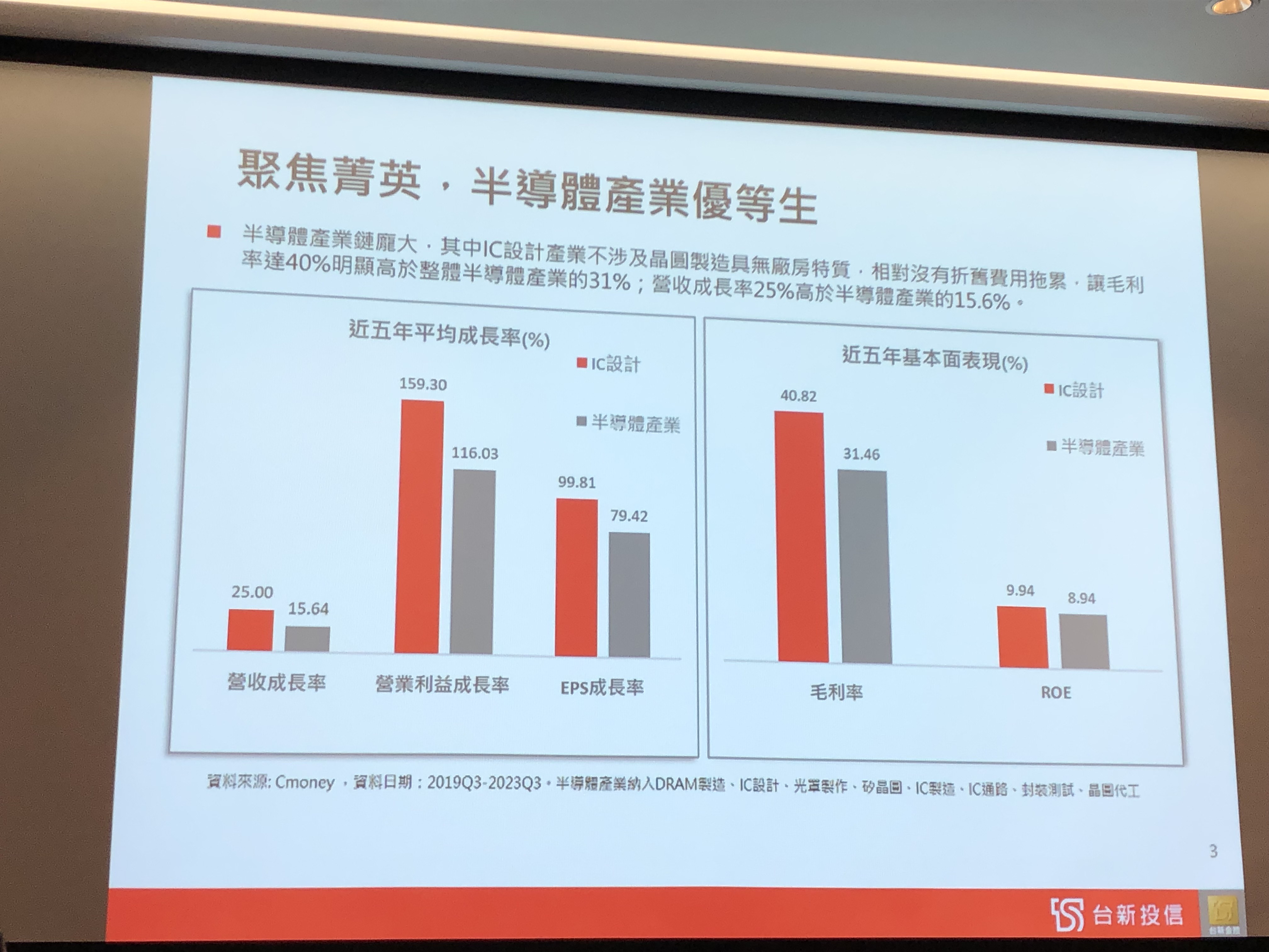 葉柱均說,台灣IC設計產業長久以來在全球競爭力始終占據領先地位,也不斷創造出高毛利及高獲利水準(如下圖,記者李錦奇攝影),IC設計股成為台股市場千金股常客,未來隨著生成式AI的興起,可望帶動台灣IC設計產業另一波成長高峰。