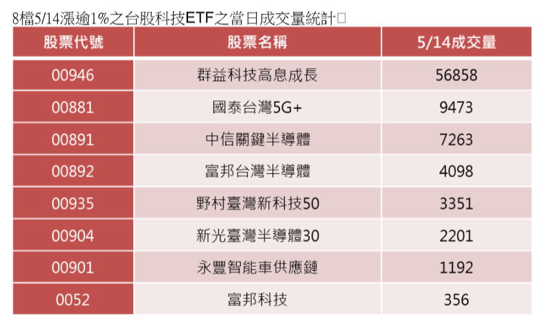 同樣地,台股ETF也是漲多跌少,且漲幅優於大盤的共計有24檔,其中,漲幅超過1%的有11檔,裡面科技相關ETF佔8檔,包括群益科技高息成長(00946)、國泰台灣5G+(00881)、中信關鍵半導體(00891)、富邦台灣半導體(00892)、新光臺灣半導體30(00904)等。