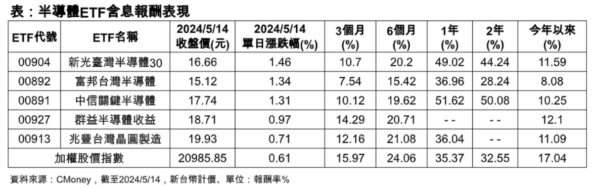 以上表可見,半導體ETF表現強勁,如果把時間拉長來看,主要投資台灣半導體類股的國內五檔半導體ETF,近1年漲幅至少36%起跳。