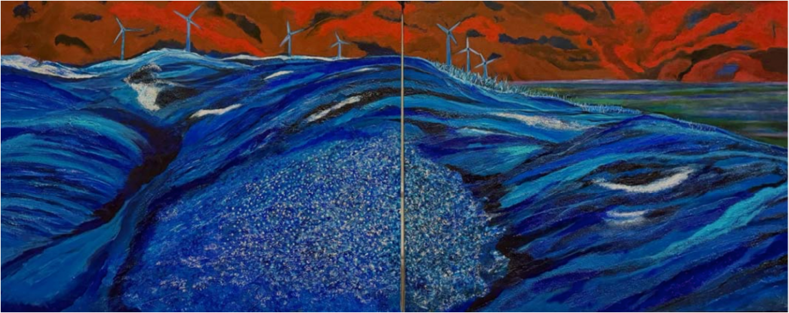 同樣是反思《環境重大變遷課題》,《暗啞的海岸(一)》 、《暗啞的海岸(二)》 創作由讓人驚艷。謝文倩以時常拍攝的好望角取景,運用大片藍色調、線條勾劃出大海鬱悶,面對陸地跟離岸出現許多風機的壓力。遠方直達天際以橘紅、暗灰橘紅渲染呈現大自然因人類不斷索求資源,終有一天爆發回擊的警示。謝文倩以回收的咖啡渣潑灑在壓克力媒材上,呈現出粗糙、反噬的抽象創作,衝擊視覺震撼。