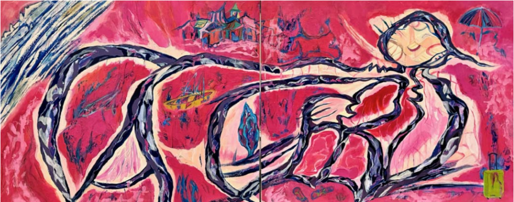 描繪女性面對傳統與追求自我的《初心》。女性追求理想又面對壓力,以一條蜿蜒曲折的血管,表現女性追求理想跟遭遇不同的挫折跟挑戰。不隨波逐流,帶著一只行李走遍天下。遠處則用白色色塊展現東南亞佛堂婆羅浮屠,提醒不忘本心。讓人驚奇謝文倩的創作,充滿勵志。律師斜槓新銳藝術家,謝文倩以新表現主義自由創作,提醒大家面對社會變遷的態樣,人類未來的思考。