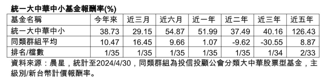 受到前幾年中國股市空頭影響,整體大中華股票型基金近三年平均績效是負30.55%,統一大中華中小基金同期間報酬率則是正的40.16%。