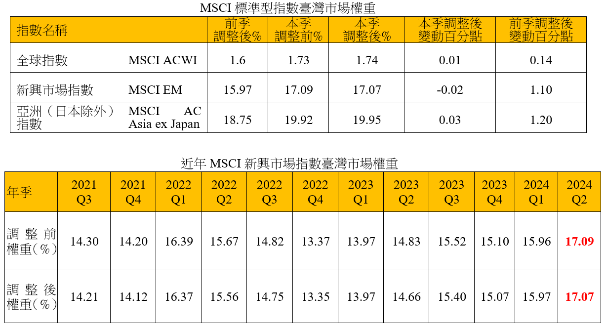 明晟(MSCI)公司今天也公布了第2季相關指數調整,台股在全球標準型指數(MSCI ACWI)權重上升0.01個百分點,新興市場指數(MSCI EM)權重下降0.02個百分點,亞洲(日本除外)指數(MSCI AC Asia ex Japan)權重上升0.03個百分點,調整後權重分別為1.74%、17.07%及19.95%,也就是2升1降,將於6月3日開盤生效。