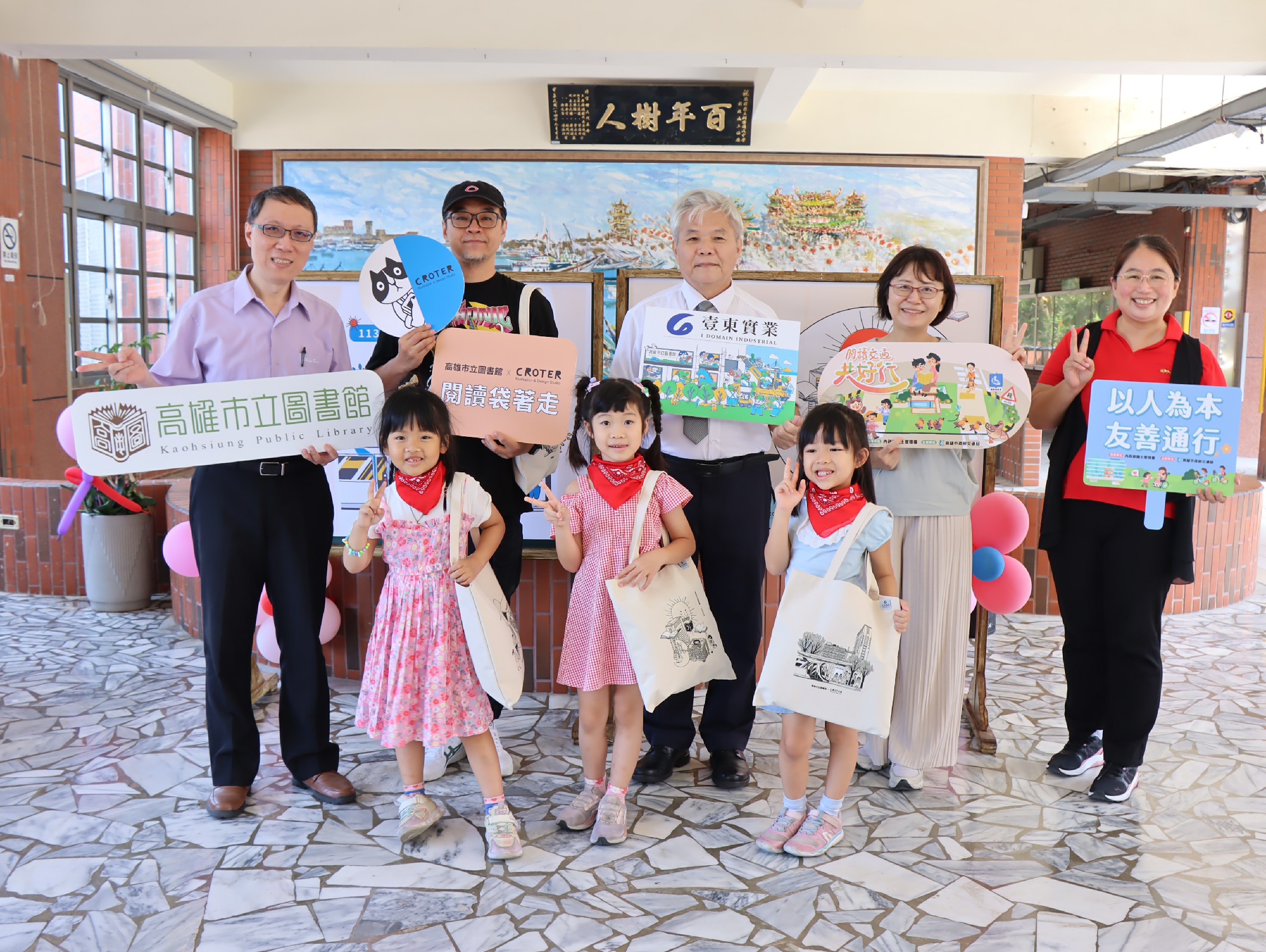 高雄市立圖書館自2021年推出閱讀提袋以來即深獲讀者喜愛,日前公開2024全新3款閱讀提袋,由高雄在地知名插畫家Croter繪製。為推廣偏鄉閱讀,並傳達人本交通的概念,高市圖將行動書車行駛到蚵寮非營利幼兒園,由現場幼兒園小朋友以走秀方式展示閱袋,充分展現童趣,以及彰顯閱讀向下扎根的意義。現場由最新款交通共好行書車帶來滿滿的故事書,同時有肩負物流重任的通閱車車體的彩繪由Croter操刀設計,可愛又富有童趣的繪本畫風,受到孩子們的矚目,紛紛借書閱讀。