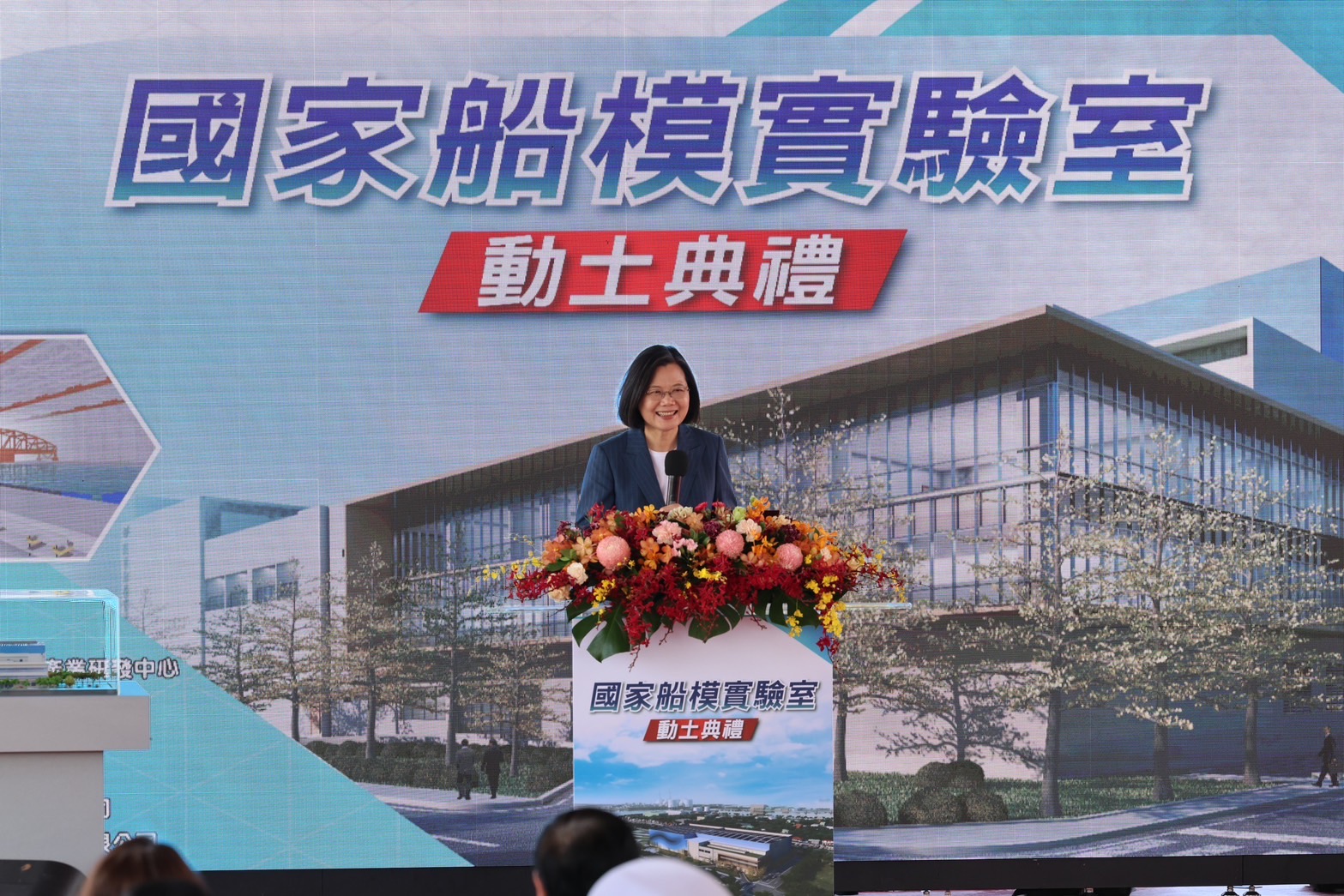 總統蔡英文在致詞時指出,高雄是臺灣造船產業的重鎮,擁有頂尖的造船技術與專業人才,以及完善的供應鏈,已形成完整的船舶產業聚落,為我國造船業發展奠下堅實根基。為提升我國船艦自主研發能力,2年前來高雄見證了「船模試驗國家隊」的成立,向各界宣示,我們會將最重要的船艦試驗工作,留在臺灣的決心。今日我們再邁出關鍵的一步,一起見證「國家船模實驗室」的動土典禮,藉這個機會,感謝所有造船產業先進的支持,共同為海洋事務發展貢獻心力;感謝海洋委員會與國家海洋研究院與所有參與這項工程的夥伴,克服種種困難,打造屬於臺灣自己的實驗室,臺灣繼續經由海洋鏈結世界,也期盼透過「國艦國造」一起堅守台灣的民主、自由,也為國人打造一個更繁榮安全的國家。