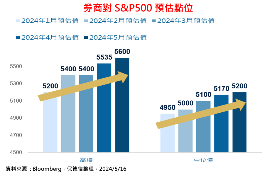 以目前S&P500指數來到5308點計算,距離華爾街各大券商最樂觀的目標價,大概還有5.5%的上漲空間。
