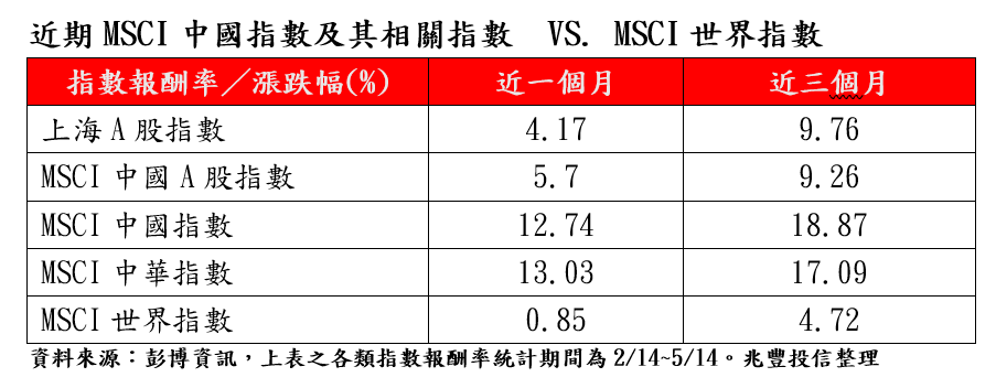 中國股市近期鹹魚翻身,統計近三個月,上海A股指數報酬率漲幅9.76%、MSCI中國指數為18.87%,遠超過MSCI世界指數的4.72%,法人認為,MSCI日前發布最新季度審查,海信家電等8檔中國A股被納入全球標準指數成分股,將於5月31日收盤後生效,這項消息挹注A股近期走勢續揚,有助帶動科技業、家電業、鋼鐵業及能源業等題材續航。