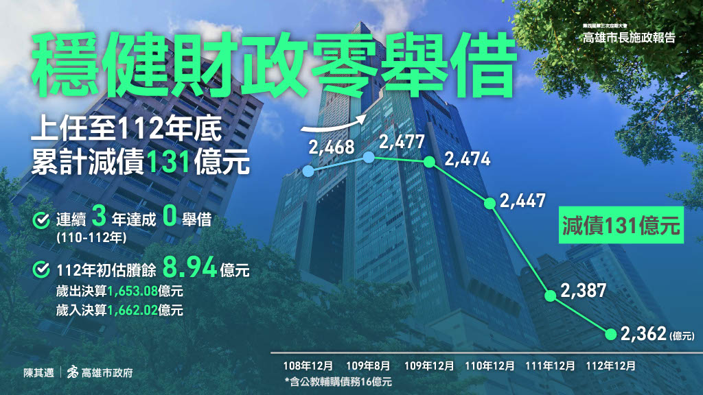 高雄市長陳其邁自109年8月上任後,從110年起已連續3年達成0舉借,受限債務已減債131億元(包含償還公教輔購基金借款16億元);另外善用自償性債務推動更多市政建設,落實財政健全。