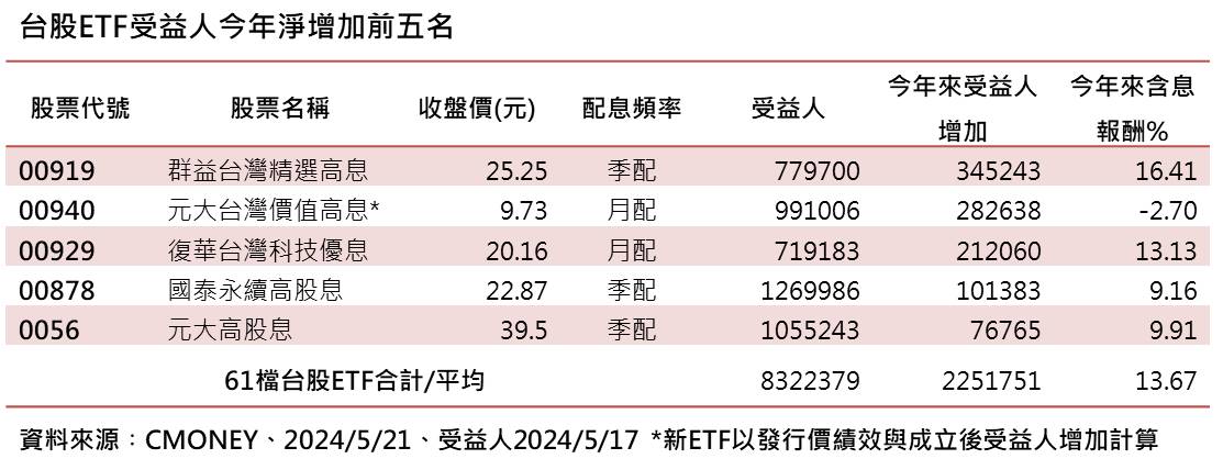進一步觀察今年來受益人淨增減(扣除今年新成立ETF),其中,群益台灣精選高息ETF(00919)增加34.5萬人最具人氣,其他依序是元大台灣價值高息(00940)、復華台灣科技優息(00929)、國泰永續高股息(00878)、元大高股息(0056),清一色都是高息ETF,光這五檔就新增了172.6萬受益人,顯示出台股高息ETF受到投資人喜愛。