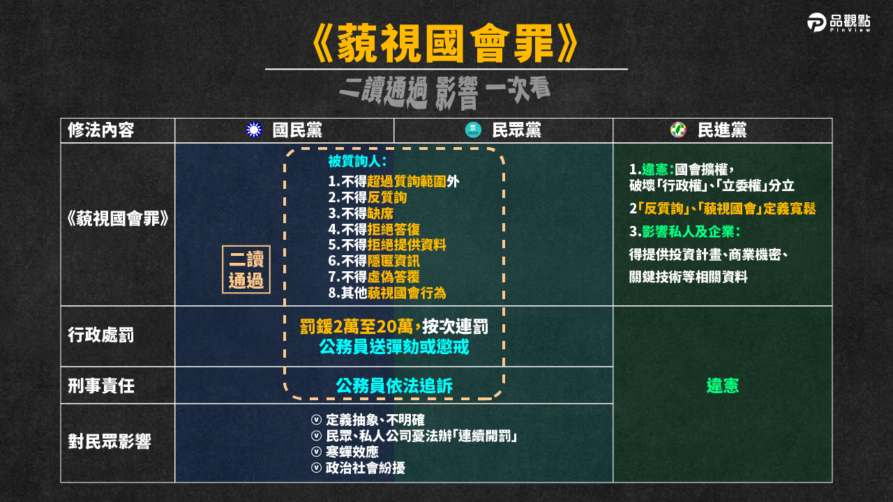 國會改革法案,立法院場內朝野激烈對抗,場外公民團體發起集結抗議。最終仍二讀表決通過藐視國會罰則、國會調查權、強化立法院人事同意權等重大爭議條文。而《刑法》增訂藐視國會罪尚未處理,也讓場內外關注。二讀通過的《藐視國會罪》內容和影響,《品觀點》整理簡易懶人包一次看。