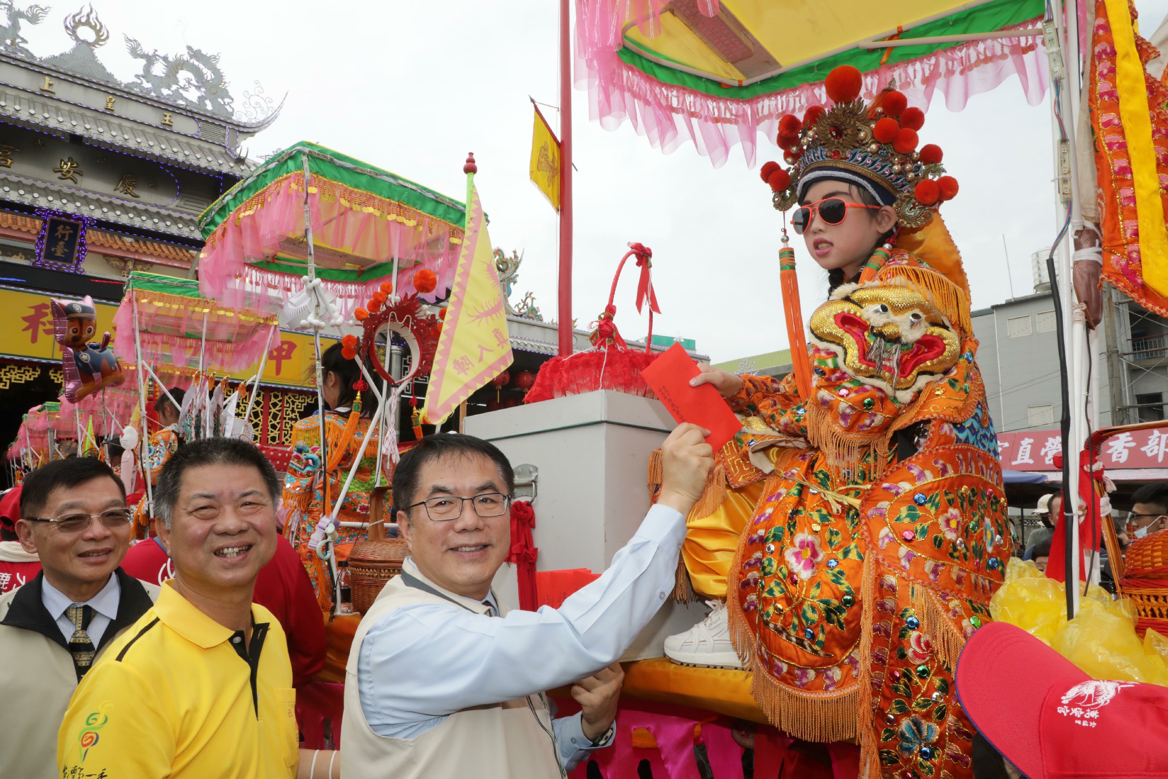 ↑圖說:市長黃偉哲發紅包給蜈蚣陣小神童 (圖片來源:台南市政府提供)