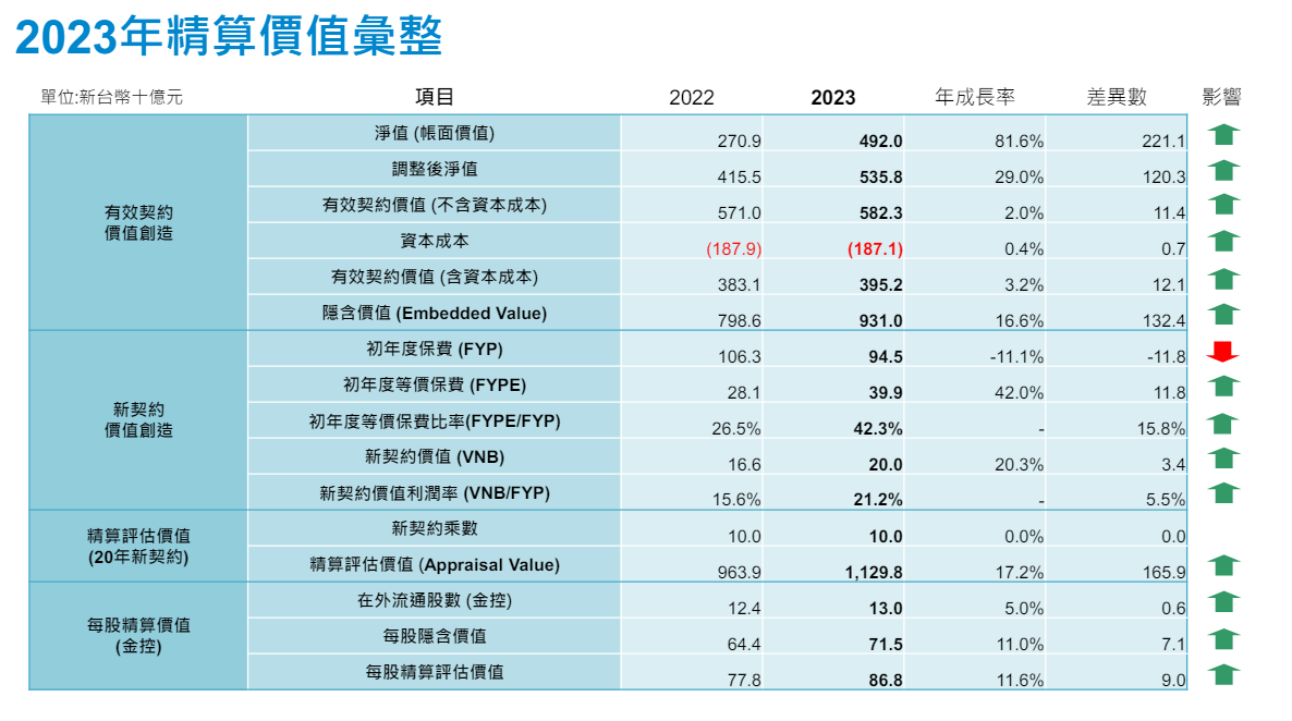 富邦人壽2023年底調整後淨值,上升至5358億元,年成長29%;有效契約價值3952億元,年成長3.2%。