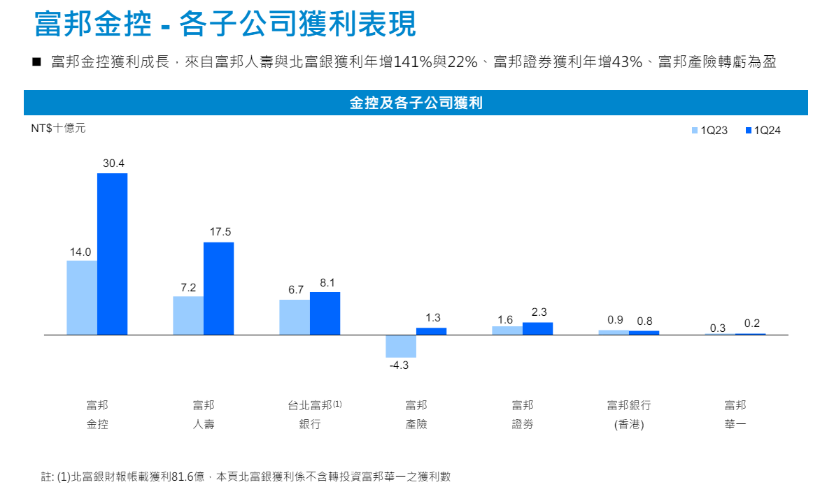 子公司部分,富邦人壽首季稅後淨利174.6億元,居業界第二。截至3月底總投資資產達4兆9934億元,受惠利率走升與美元升值,首季經常性投資收益年成長8.6%。
