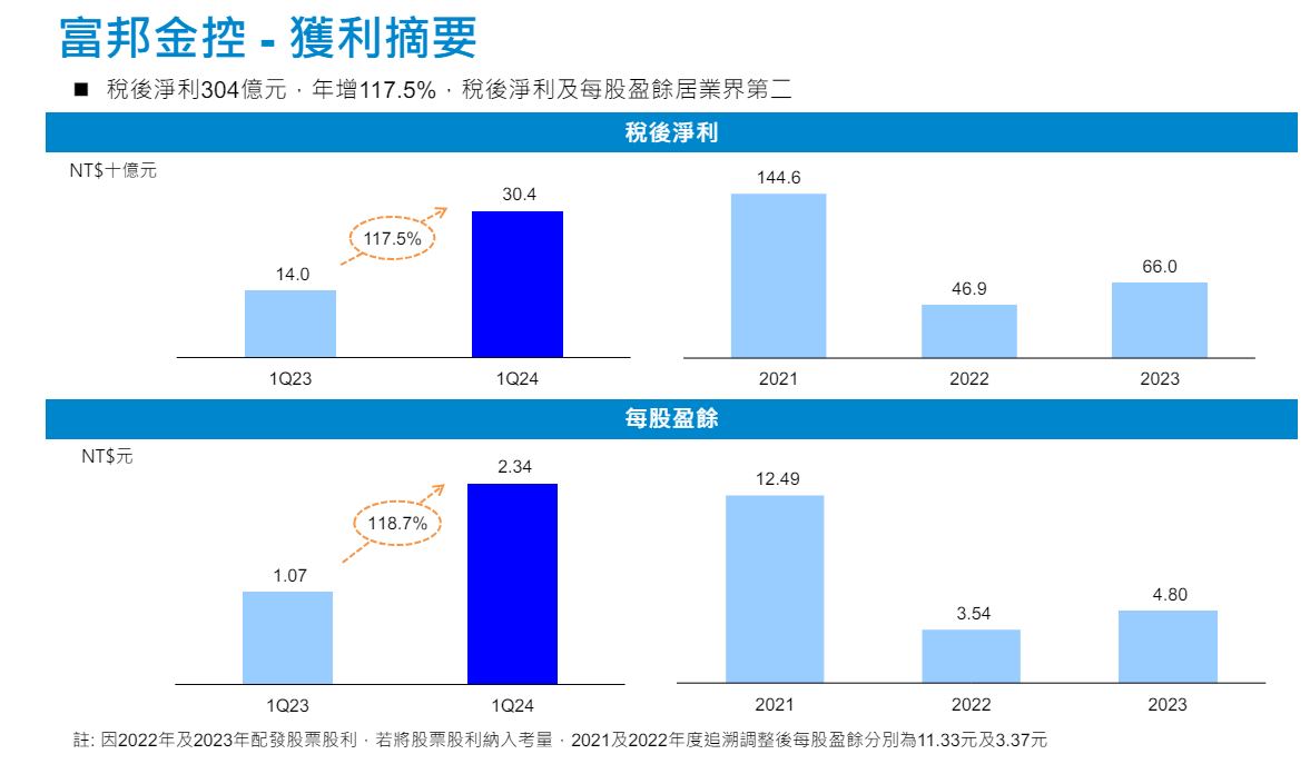 至於富邦金首季獲利表現,稅後淨利304.1億元、年增117.5%,每股盈餘(EPS)2.34元,稅後淨利、每股盈餘居業界第二。