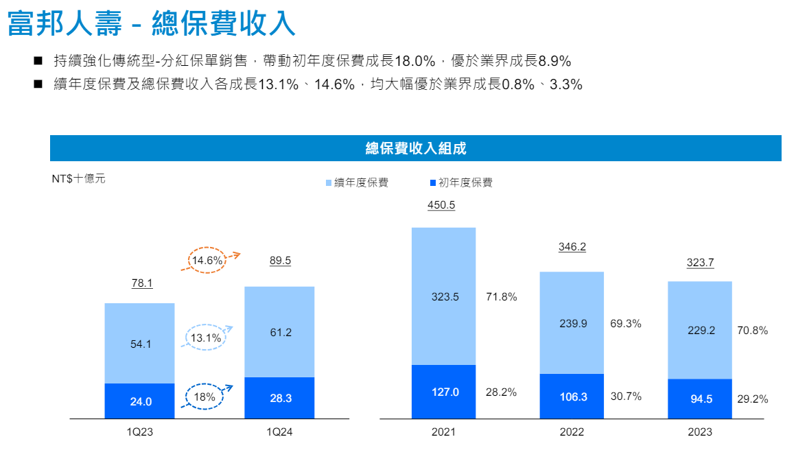 富邦人壽持續強化傳統型分紅保單銷售,帶動初年度保費(FYP)較去年同期成長18%,居業界第一;總保費(TP)及初年度等價保費(FYPE)均位居業界第二。