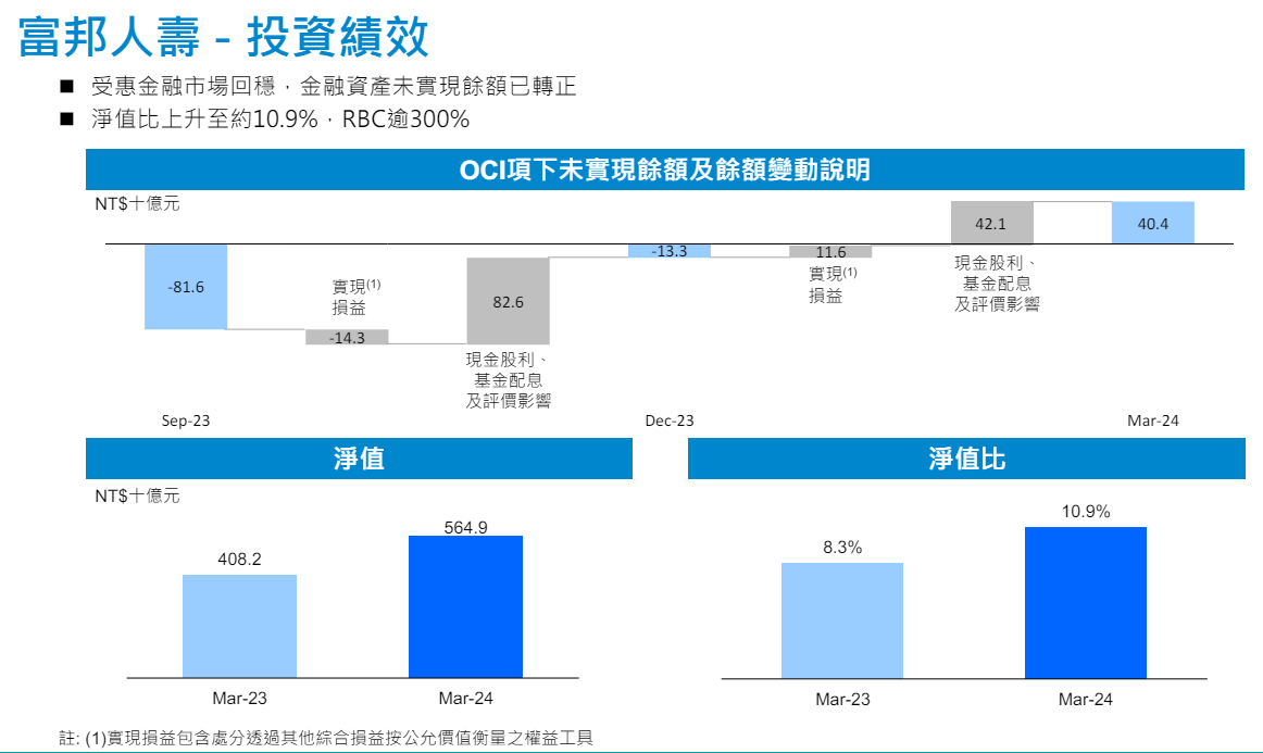 受惠金融市場回穩及股票評價上揚,富邦人壽金融資產未實現餘額,首季已由負轉正,截至3月底淨值比約10.9%,資本適足率(RBC)逾300%。