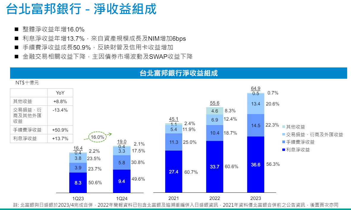 台北富邦銀行首季稅後淨利81.6億元,續創歷史同期新高。其中,手續費淨收益年成長達50.9%,反映財管及信用卡業務收益增加;授信部份,整體授信餘額年增12.8%,其中,企業授信餘額年增14.9%;個人授信部份,房屋貸款餘額突破1兆元,年成長達10.9%,其他個人授信餘額年增16.6%。