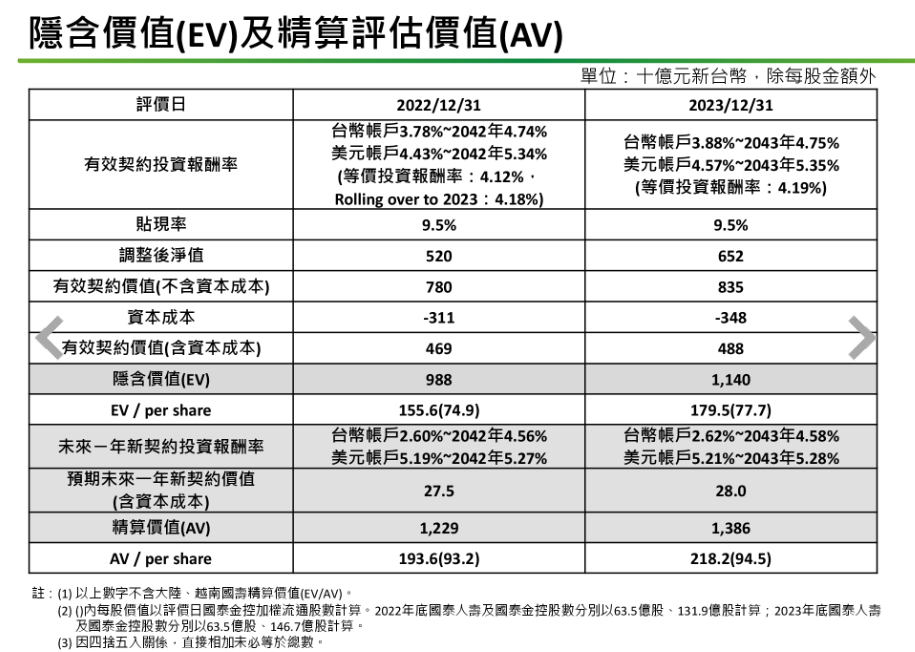 至於隱含價值也由2022年底的9880億元,增至1兆1400億元,增幅15%,以金控股數計算,每股隱含價值(EV)由2022年底的74.9元,上升至2023年底的77.7元;每股精算價值(AV),由2022年底的93.2元,回升至2023年底的94.5元。