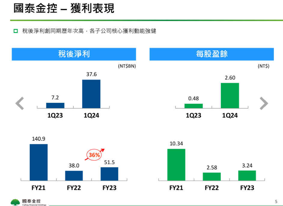 國泰金首季稅後淨利376億元,創歷史次高,EPS達2.6元,一舉超越富邦金,搶下金控獲利王。