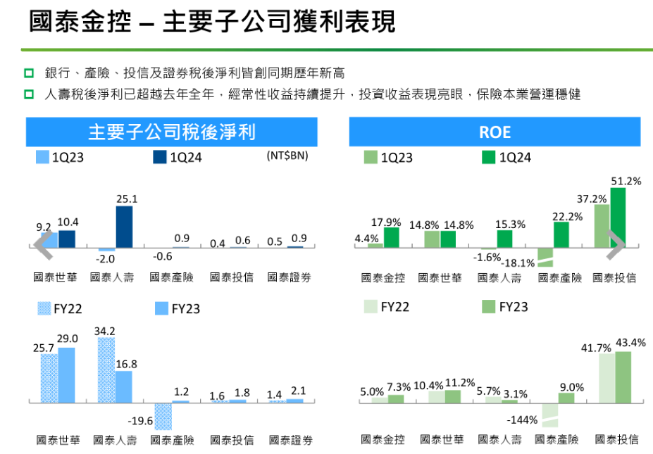子公司部分,國泰世華銀首季獲利創同期新高,年增14%。其中,財富管理及信用卡手續費收入動能強勁,帶動淨手續費收入年成長43%。
