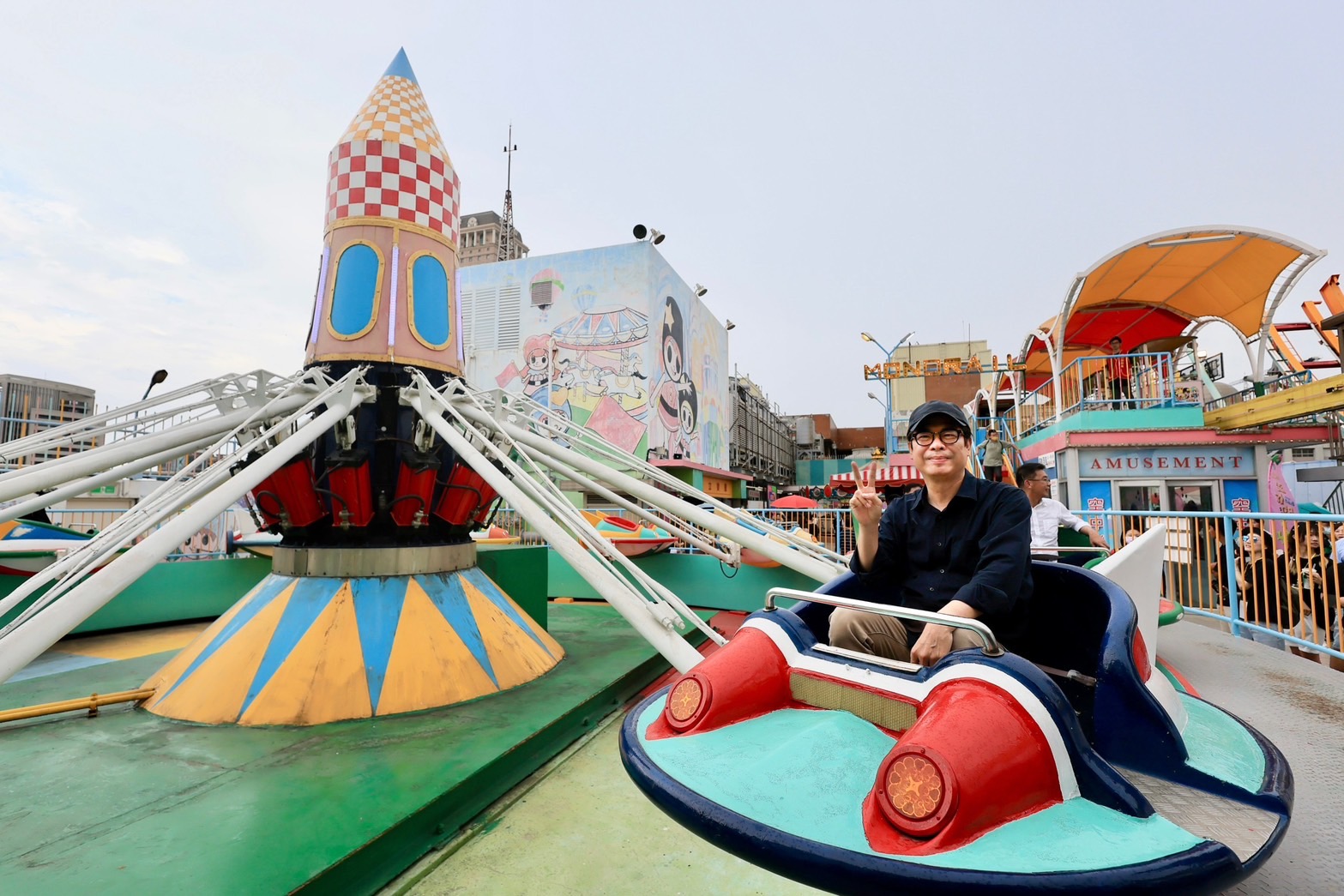 ↑圖說:2024雄校聯社團成果發表於大立百貨空中樂園登場,陳其邁乘坐「太空爭霸戰」設施。(圖片來源:高雄市青年局提供)