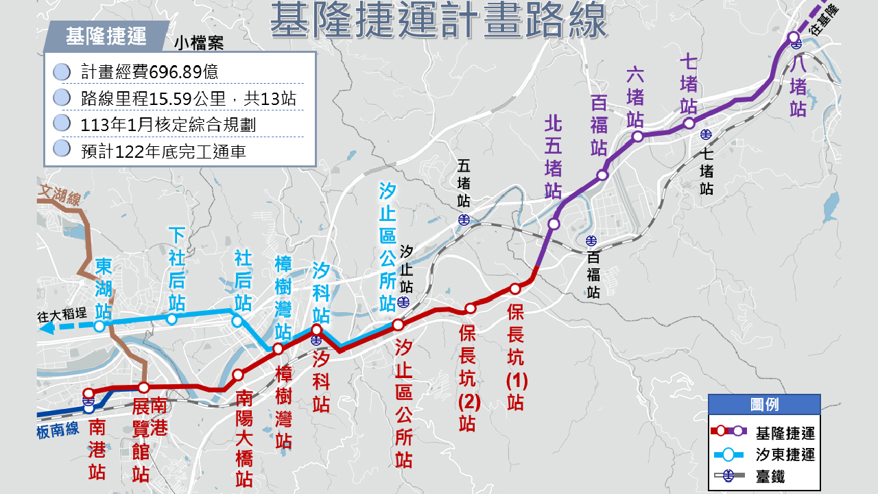 基隆市長謝國樑表示,基隆捷運對紓解交通及未來產業及城市生活圈發展非常重要。綜合規劃路線橫跨北北基三市共設置13站,全長15.6公里,基隆段將設置八堵、七堵、六堵、百福、北五堵等5站,基隆捷運第一階段完工通車後,可將南港八堵區間旅次納入捷運系統服務。