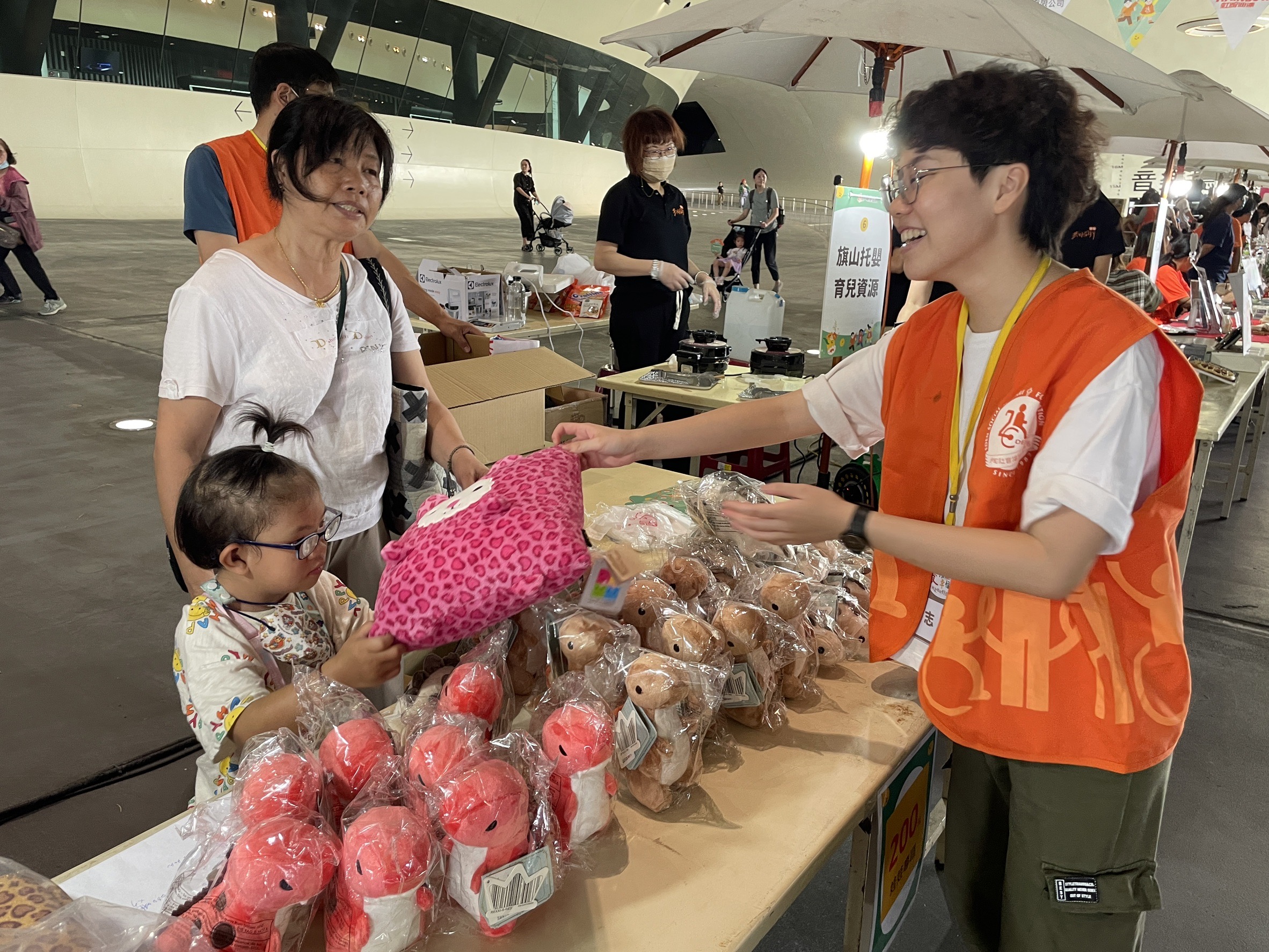 活動現場設有好朋友小小市集,綁著頭巾的「小小店長」,其來自鳳山早療中心的慢飛天使。慢飛天使小妤使勁的叫賣聲,讓爸爸媽媽帶著小朋友不只來參加,同時也可以和慢飛天使互動,增進共融的機會。還有童趣闖關遊戲的親子活動,家長和小朋友一起完成闖關,還有小禮物可以拿,好玩又有趣。