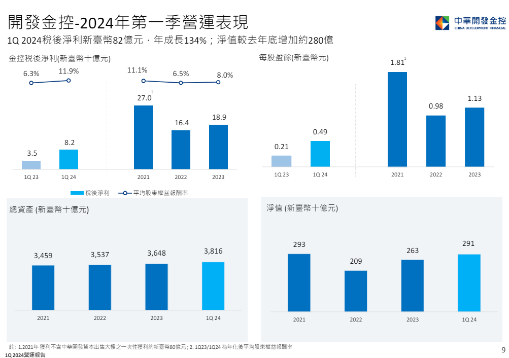 獲利部分,開發金首季稅後淨利82億元,年成長134%。每股盈餘0.49元。