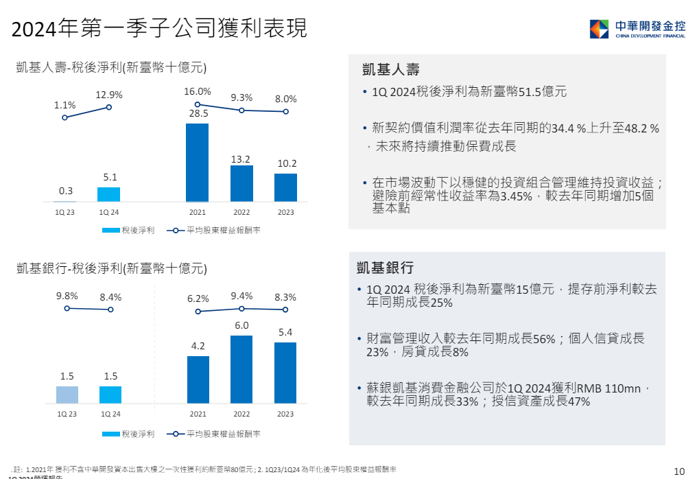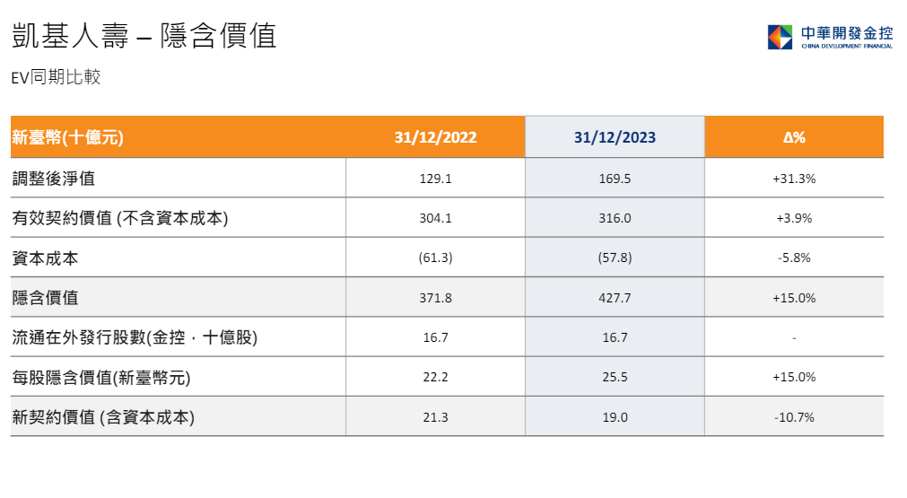 開發金今天召開法人說明會,揭露首季淨值比去年底成長11%,來到約2910億元;子公司凱基人壽隱含價值由2022年底的3718億元,升至2023年底的4277億元,增加15%,如果以金控股數計算,開發金每股隱含價值由2022年底的22.2元,增至2023年底的25.5元。