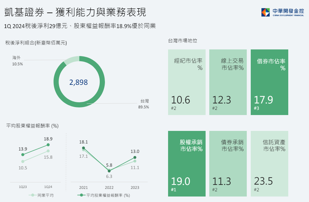股權承銷居業界第一、債券承銷業界第二;經紀市佔率10.6%。