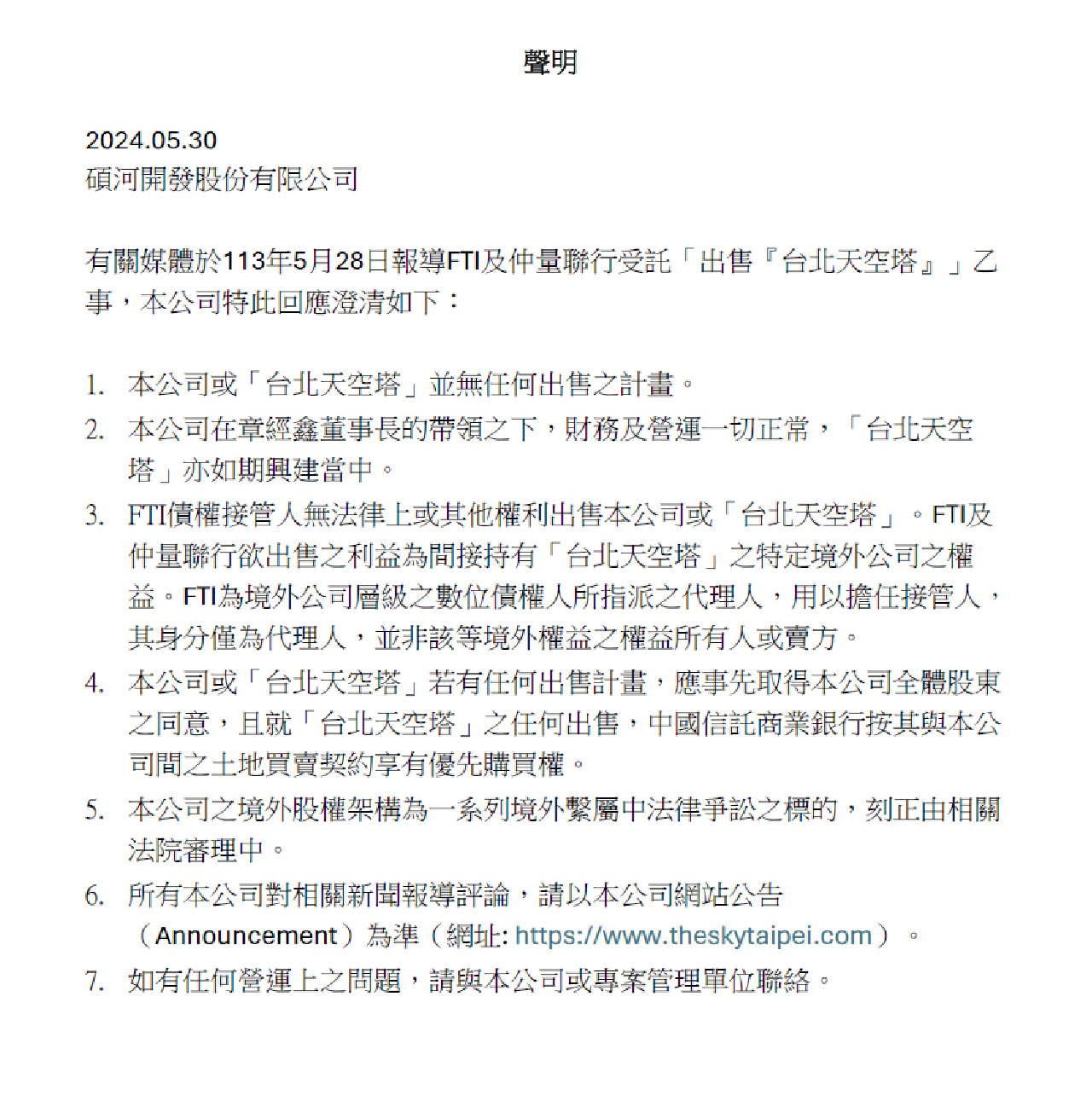 ↑圖說: 針對日前仲量聯行出售台北天空塔股權一事,開發商碩河公司發表7點聲明,表示碩河或台北天空塔並無任何出售計畫,FTI債權接管人無法律上或其他權利出售台北天空塔。(圖片來源:碩河公司提供)