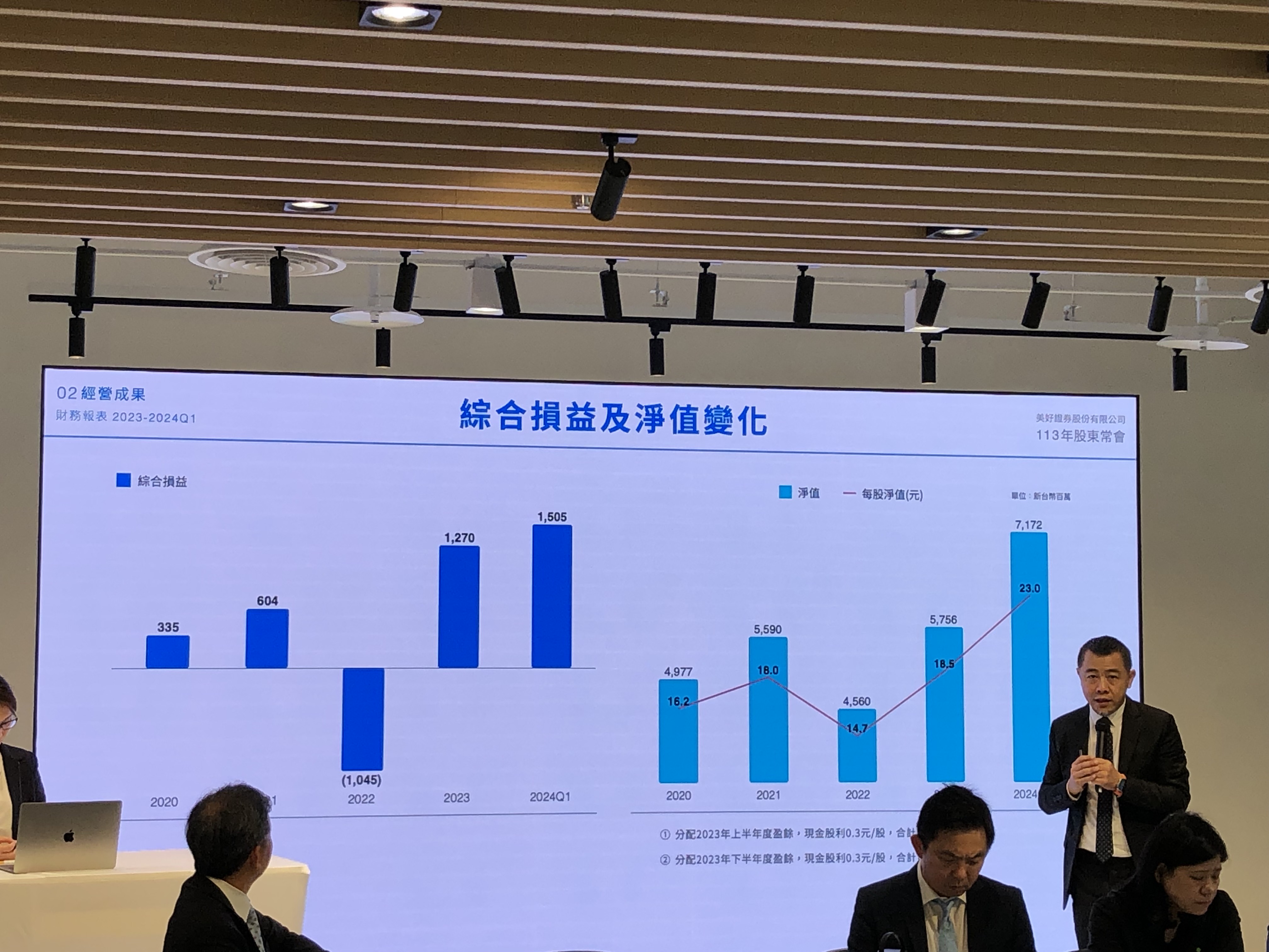 「2022年的其他綜合損益,是負的10億元,到了今年第一季,變成正的12.86億元,比去年同期的5.79億元增加非常多,股東問我做了什麼?其實也沒做什麼,就是股票抱著,隨著股價反彈而回升!」黃谷涵一派輕鬆地解說了美好證券其他綜合損益大增的原因。