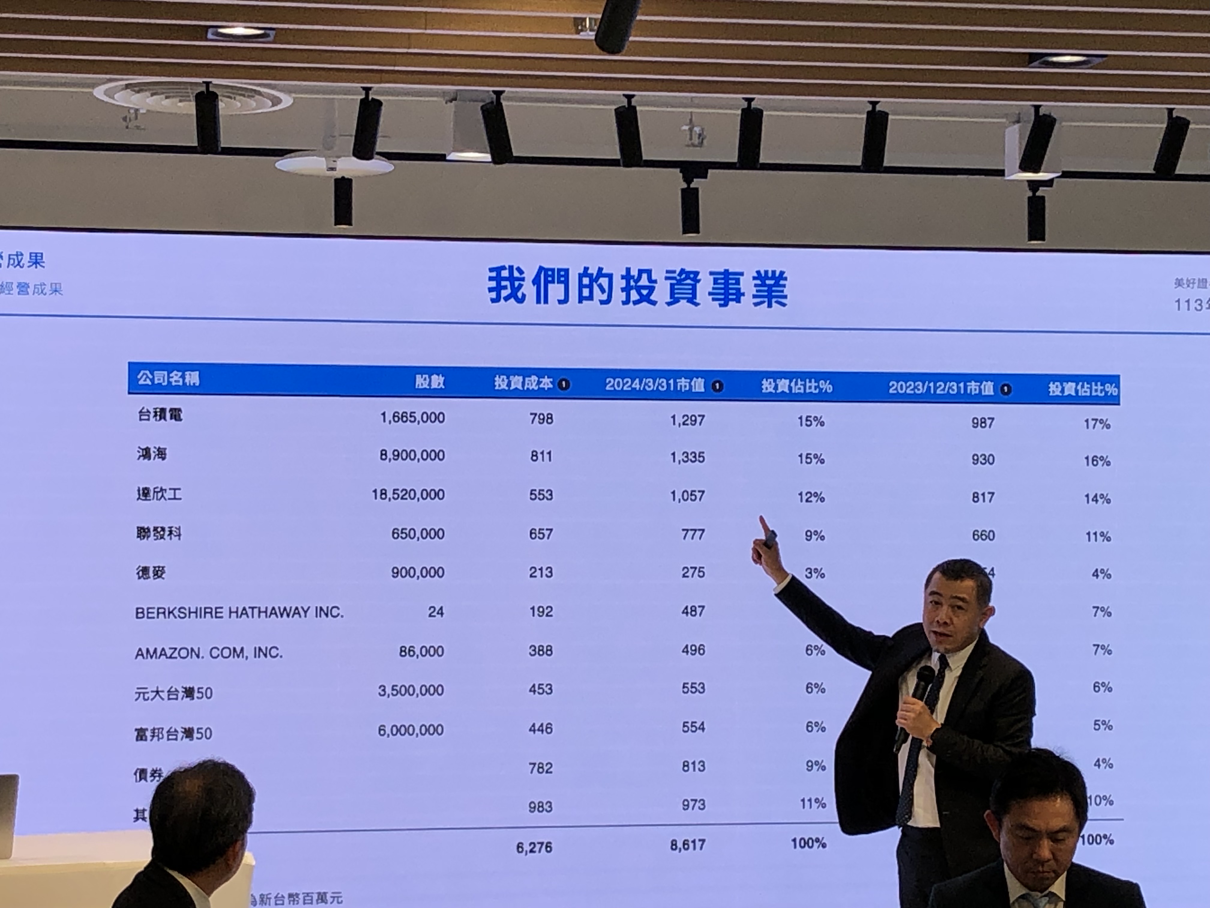 黃谷涵說:「我們持有很多台積電股票,2022年,台積電稅後淨利6千億元,2023年增至1兆元,但股價在這過程,曾從670元跌至370元,對我們的綜合損益會有很大變化,但你持有不動,時間到就會反映股價回來,370元到再創新高,看起來,表面上波動很大,但實際上就是穩健結構在經營」。