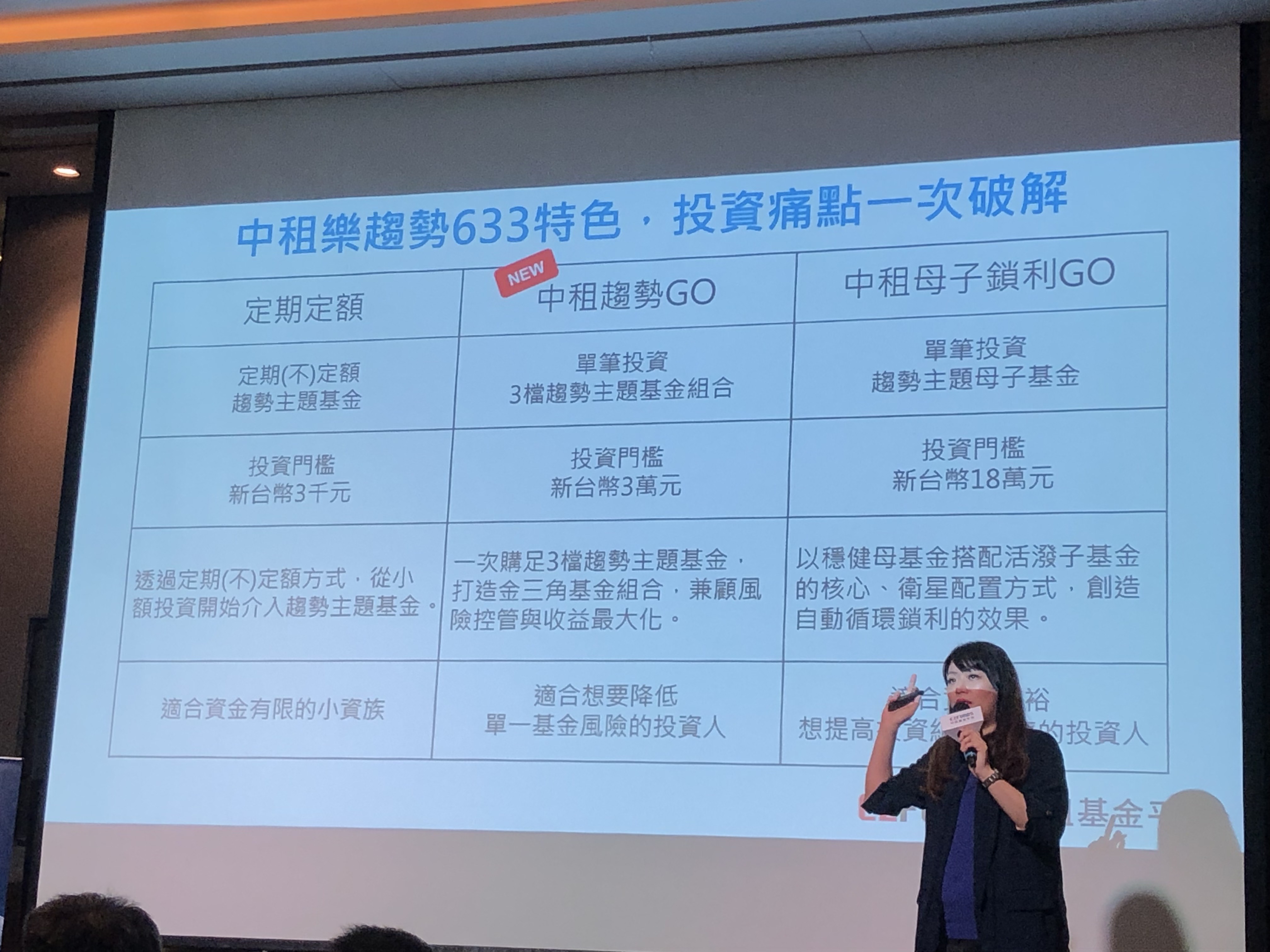 中租基金平台董事長陳俊傑指出,投資人可以透過「樂趨勢」,評估自己的風險,選出適合的投資組合,快樂投資。他還以四句箴言「投資看未來、未來抓趨勢、趨勢配對策、對策樂趨勢」,幽默點出「樂趨勢」專案核心。
