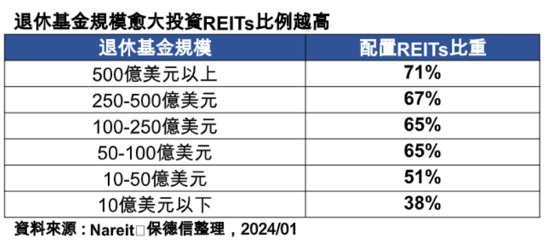 退休基金對於REITs(不動產信託基金)的喜愛,日益增溫,保德信統計截至2024年1月資料,美國超過1800個退休金計畫,其中有733個投資於REITs,總管理規模高達7兆美元,且觀察不同規模之退休基金配置REITs的比例,可以發現規模愈大的基金,配置REITs的比例愈高。