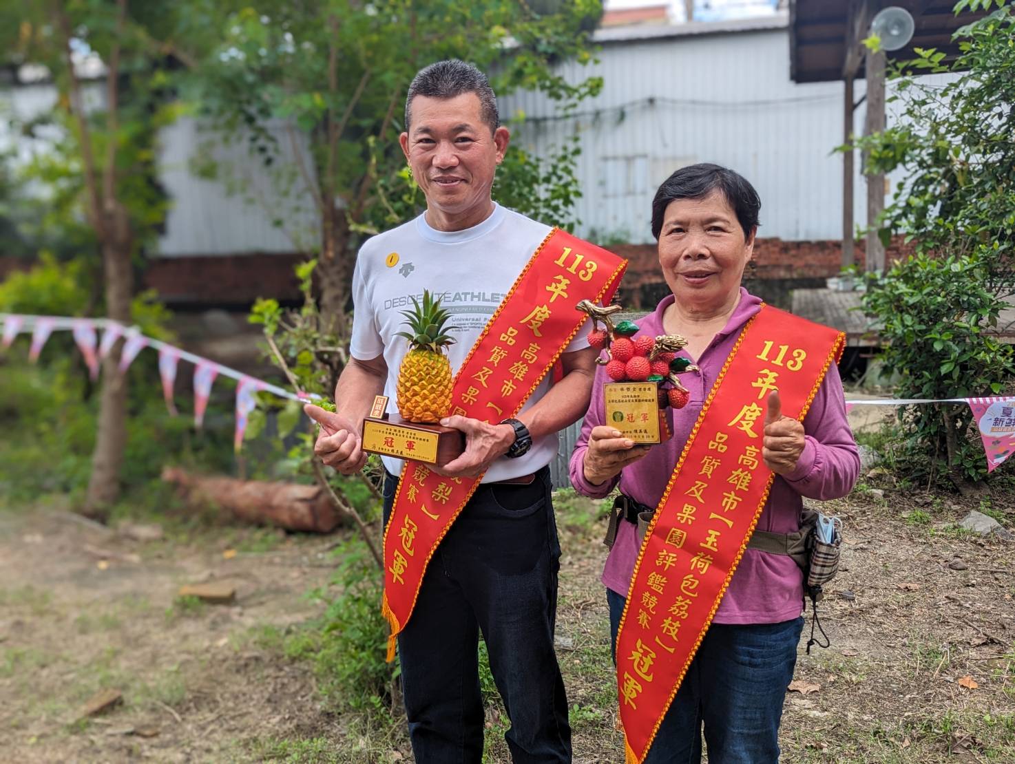 ↑圖說:「113年金鑽鳳梨、玉荷包荔枝品質及果園評鑑競賽」結果揭曉,今年度的鳳梨冠軍得主為大樹區謝清男農友(左),玉荷包冠軍由大樹區林哲全農友(由太太林蔡淑娥代領)奪得。(圖片來源:高雄市農業局提供)