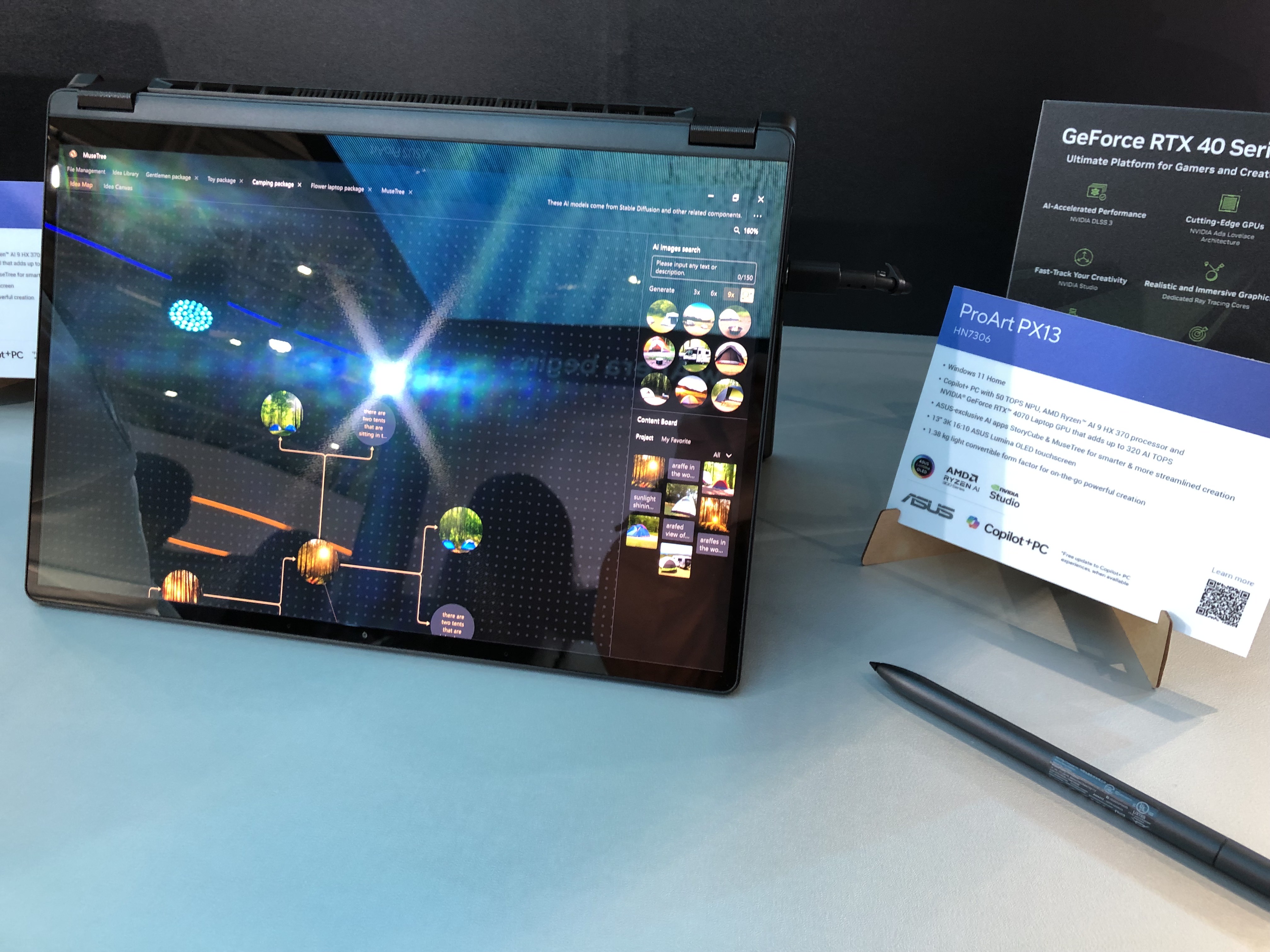 可翻轉的ProArt PX13(如上圖,記者李錦奇攝影)和P16搭載AMD Ryzen AI 300系列處理器及最高NVIDIA GeForce RTX 4070顯示卡,帶來超過300 TOPS 的 AI算力;PZ13則搭載支援AI的 Qualcomm Snapdragon處理器。