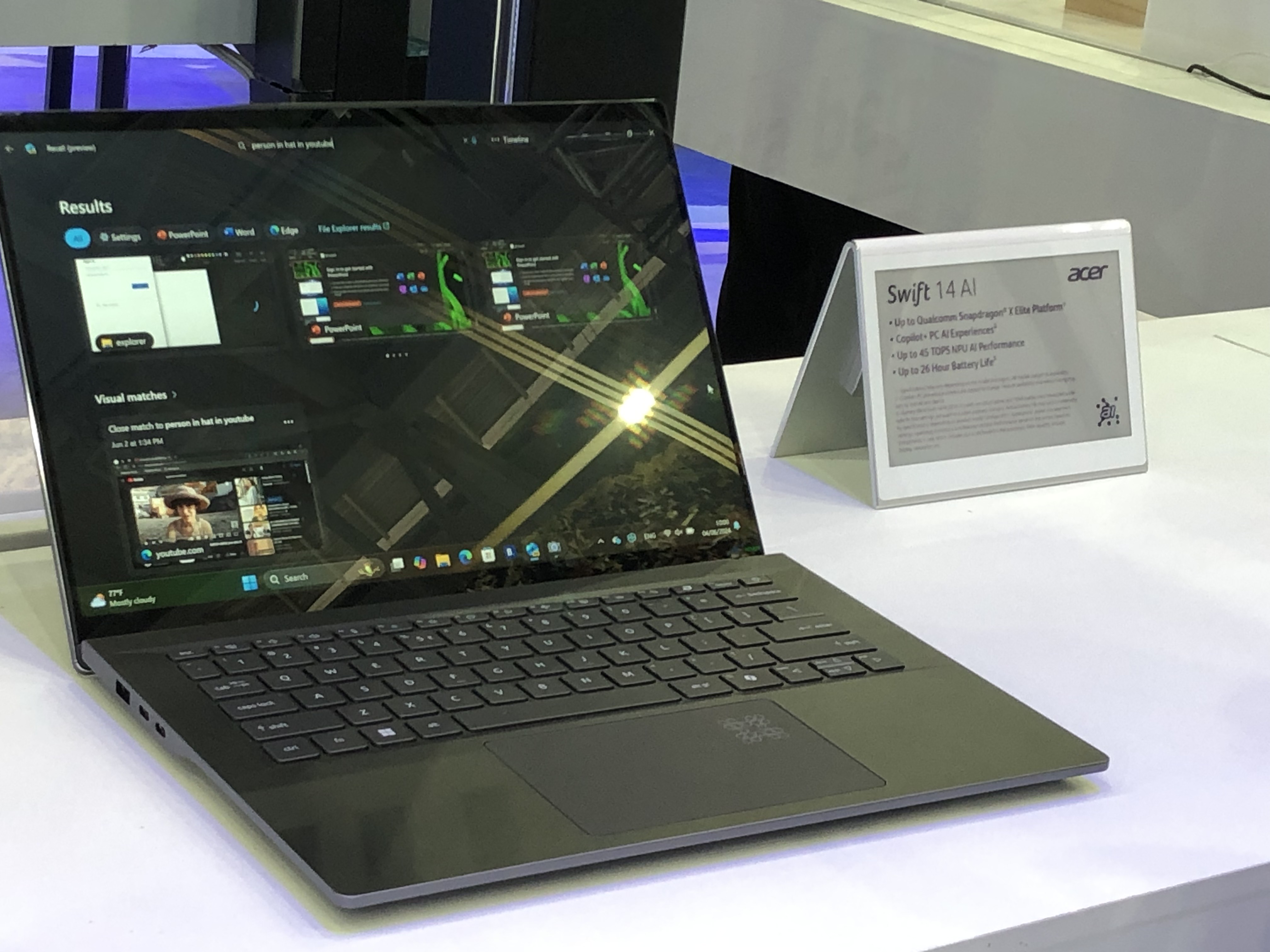 另一家筆電大廠宏碁,也秀出旗下首款Copilot+ PC:Swift 14 AI(如下圖,記者李錦奇攝影) ,搭載Snapdragon X 系列平台,提供每秒45兆次的運算力(TOPS),支援Windows 11的次世代AI功能,包含回顧(recall)、即時字幕等。