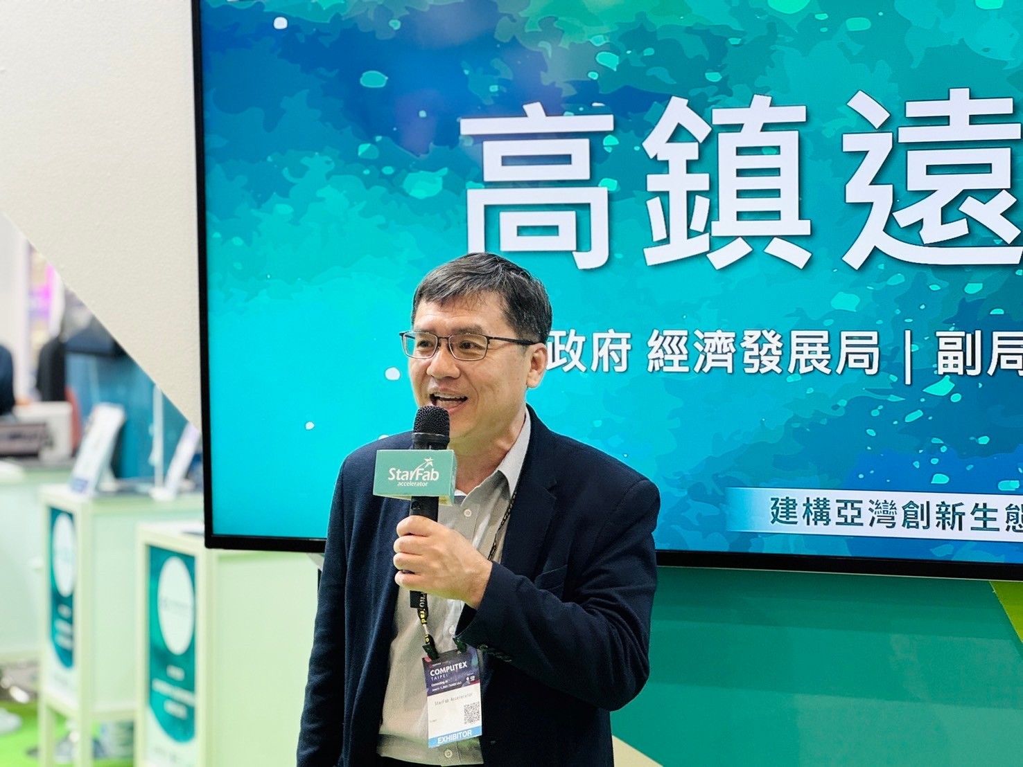 ↑圖說:高市府經發副局長高鎮遠致詞時表示,高雄長年關注5G AIoT產業政策發展,很開心參與建構亞灣生態系計畫的創新團隊,能前進可同時與海內外企業、創投、製造供應鏈建立夥伴關係的國際新創展會,展示高雄在地企業與新創攜手共贏的成功經驗。(圖片來源:高雄市經發局提供)