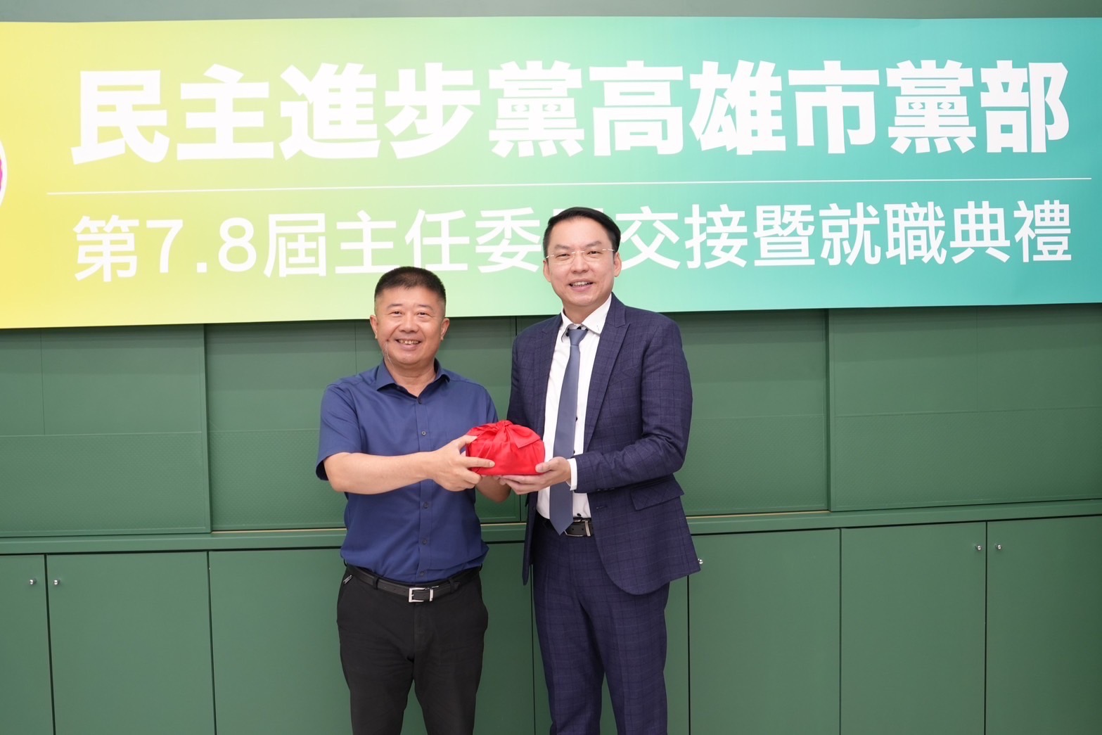 ↑圖說:第七屆黨部主委許智善交接給第八屆黨部主委黃文益(圖片來源:民進黨高雄市黨部提供)