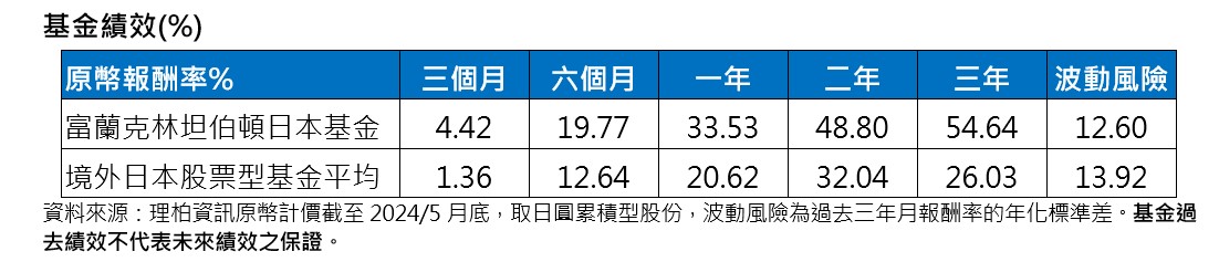 由卓兆源與邱正松操盤的富蘭克林坦伯頓日本基金,近一年報酬率達33.53%,近三年54.64%,勝過同類型基金平均,表現亮眼。