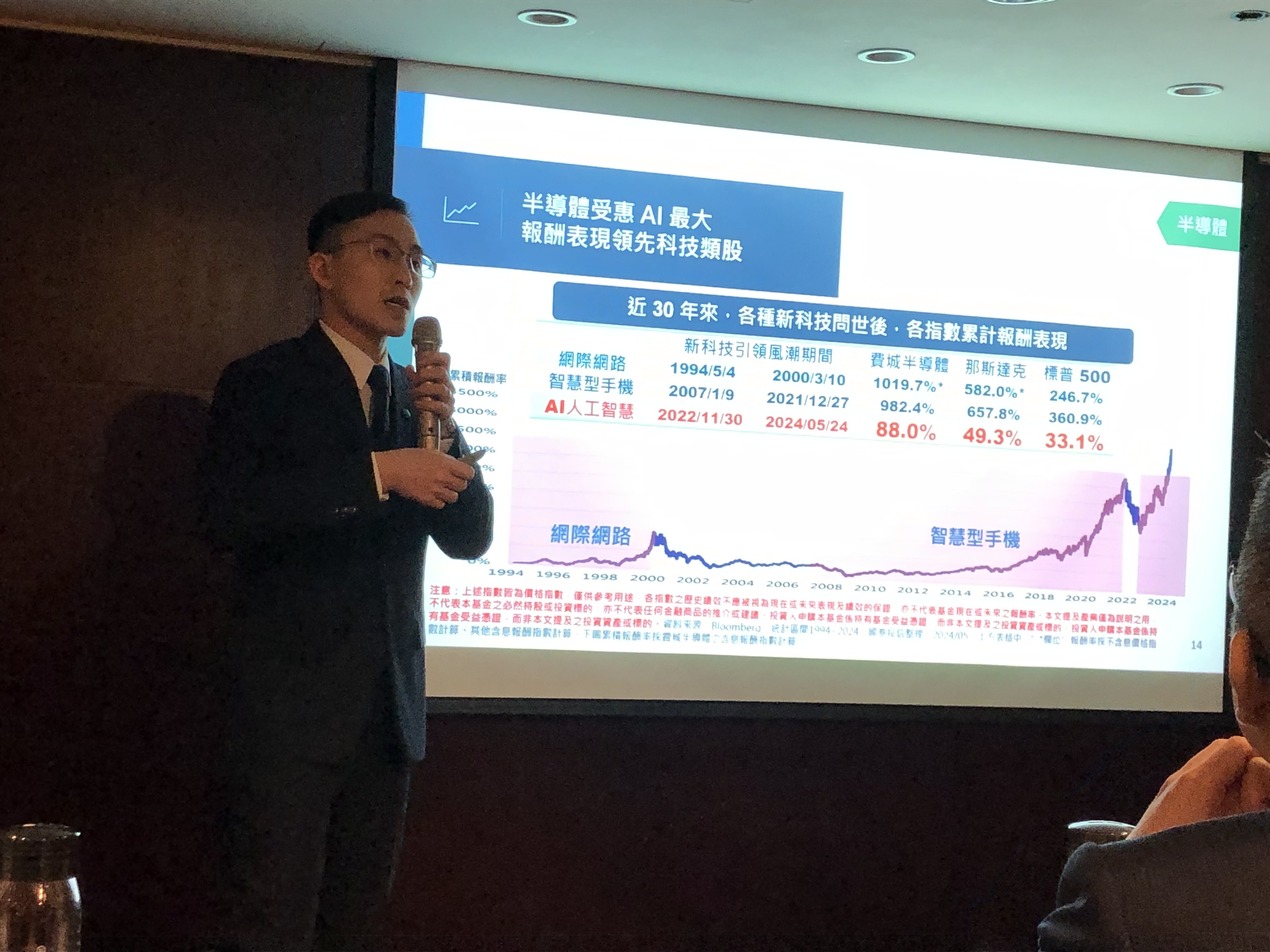 國泰費城半導體ETF(00830)經理人李翰林說,近30年來,每當各種新科技問世,都會帶動一波行情,像是網路興起(1994-2000),費城半導體指數上漲1019.7%,那斯達克指數上漲582%;智慧型手機引領風潮(2007-2021),費半指數上漲982.4%;這波AI浪潮自2022年以來,費半指數上漲88%,「對照過去經驗,現在漲幅可能連10分之1都還不到」(如下圖,記者李錦奇攝影)。