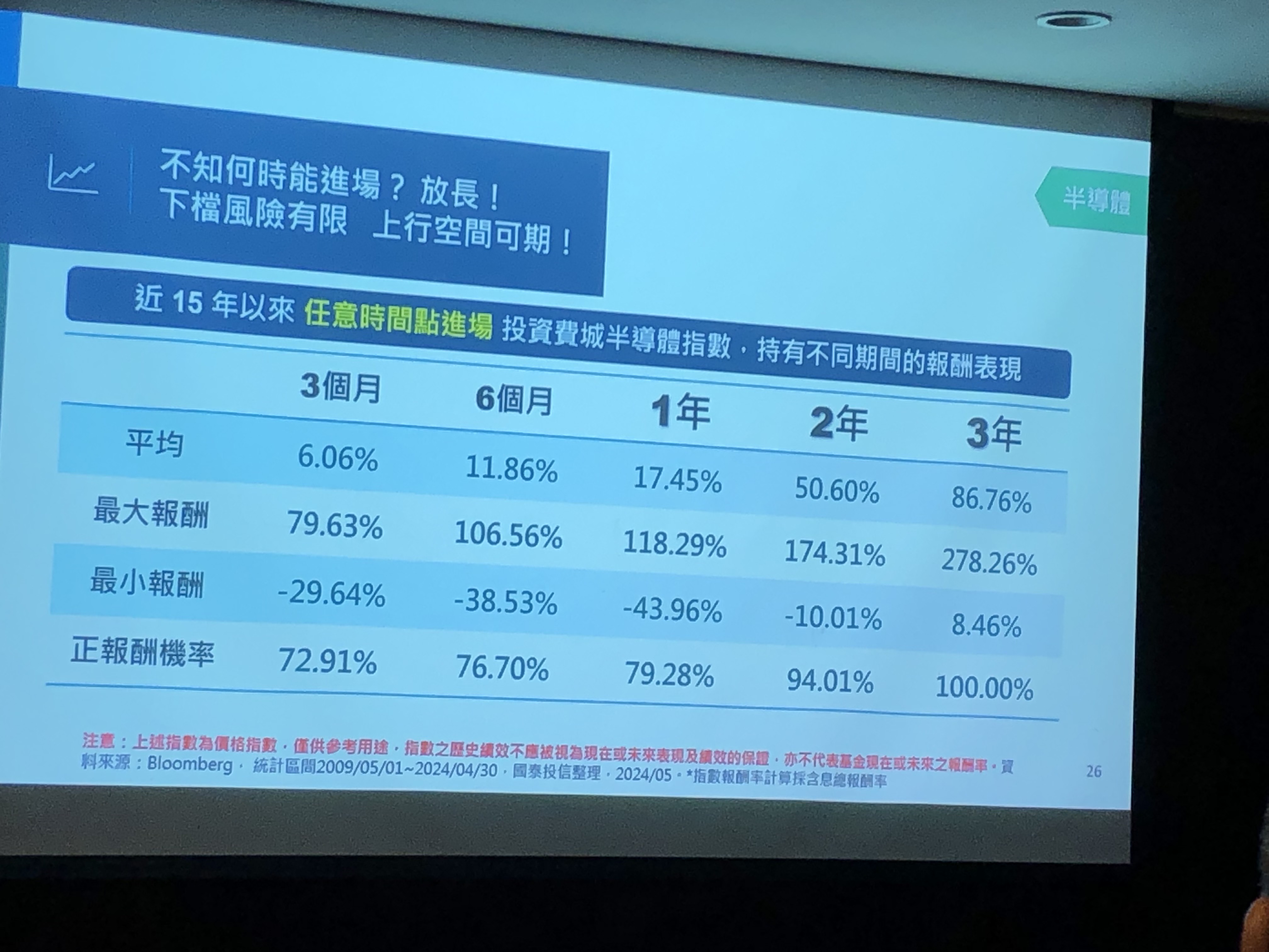 李翰林說,統計近15年以來,任何時間點進場投資費半指數,1年平均報酬率17.45%,最大報酬是118.29%,最差報酬是負的43.96%,正報酬機率79.2%;如果投資3年,平均報酬率86.7%,正報酬機率是100%(如下圖,記者李錦奇攝影)。