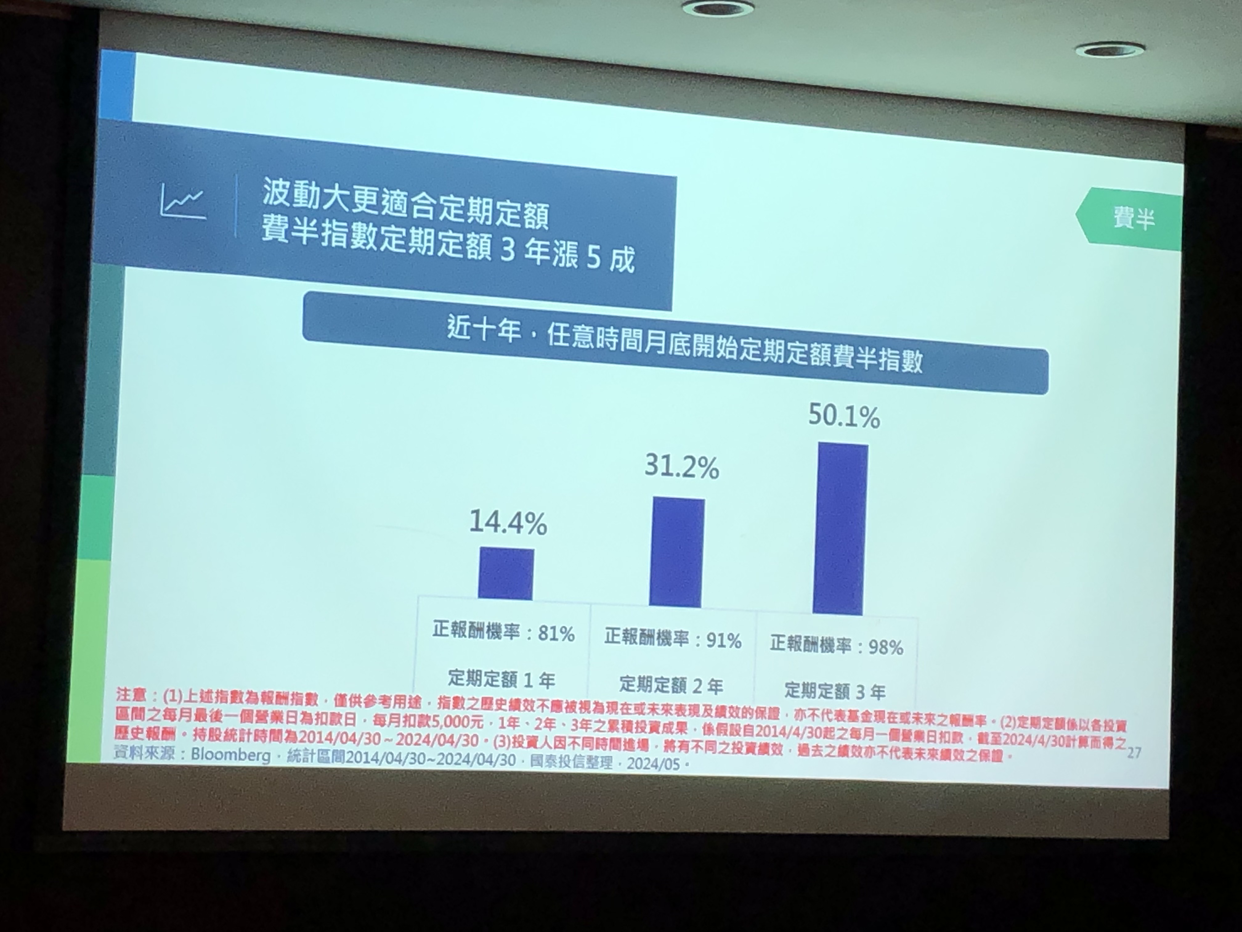 如果擔心波動大,也可採取定期定額,李翰林說,統計近10年,任意時間月底開始定期定額投資費半指數,1年累計報酬率14.4%,正報酬機率81%;3年累計報酬50.1%,正報酬機率98%(如下圖,記者李錦奇攝影)。