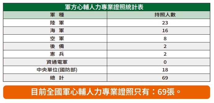 ↑圖說:全國軍15萬8千人卻只有69張心輔證照(圖片來源:林岱樺服務處提供)